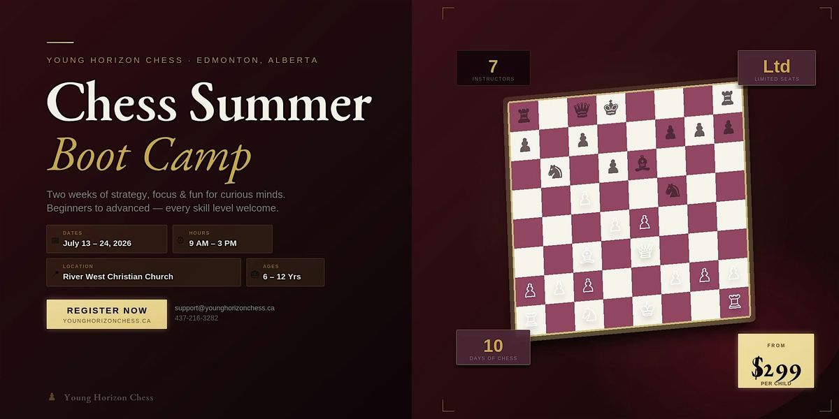A 2-week chess boot camp for kids aged 6–12. Build strategy, focus & resilience with expert instructors. Edmonton | July 13–24, 2026.