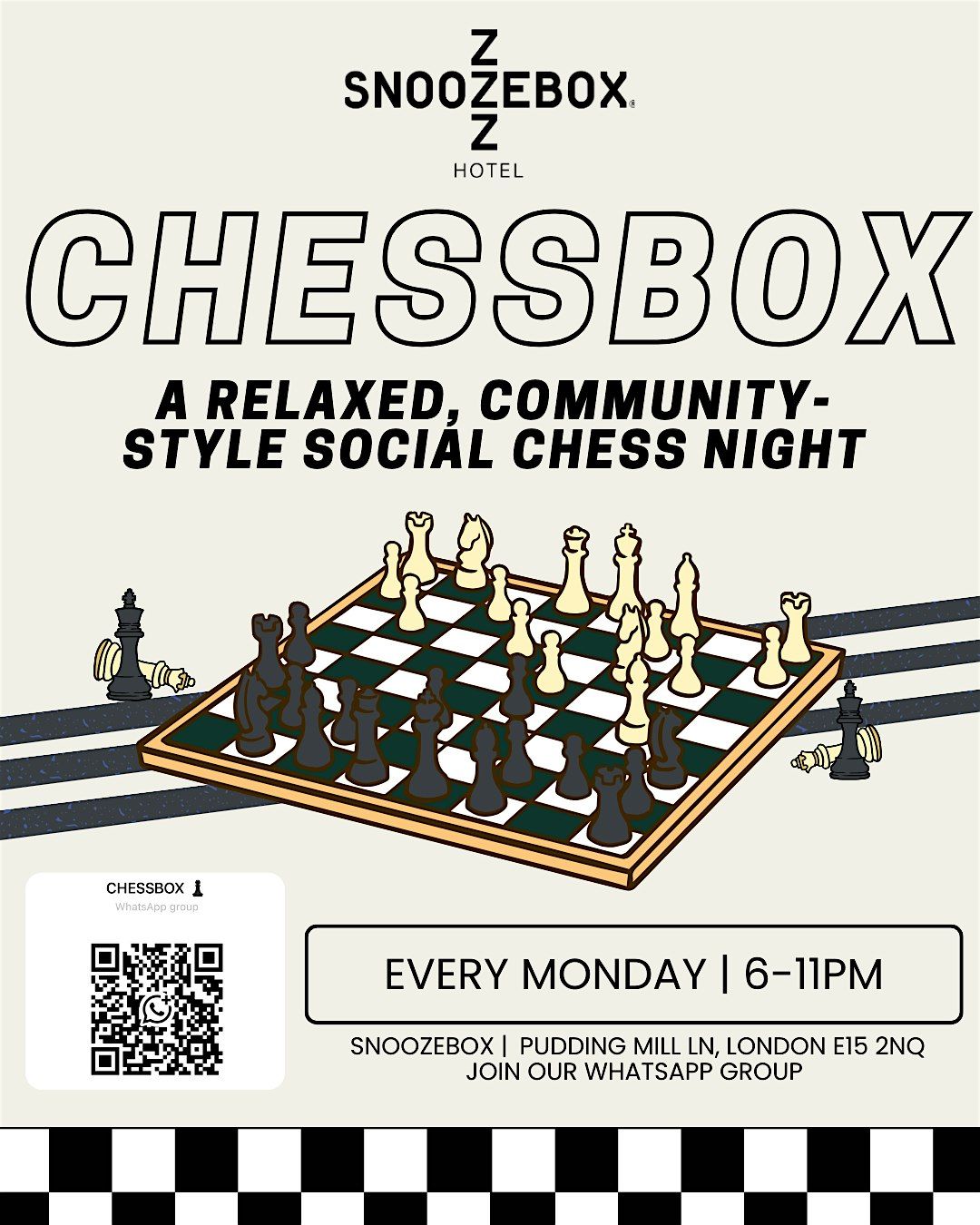 Welcome to the Chessbox! Join us for a fun-filled day of social chess at Snoozebox Olympic Park. Whether you're a beginner or a seasoned pro, this event is perfect for all chess enthusiasts. Test your skills, challenge opponents, and enjoy the thrill of the game in a vibrant and exciting atmosphere. Don't miss out on this opportunity to showcase your strategic moves and meet fellow chess lovers. See you at Chessbox!