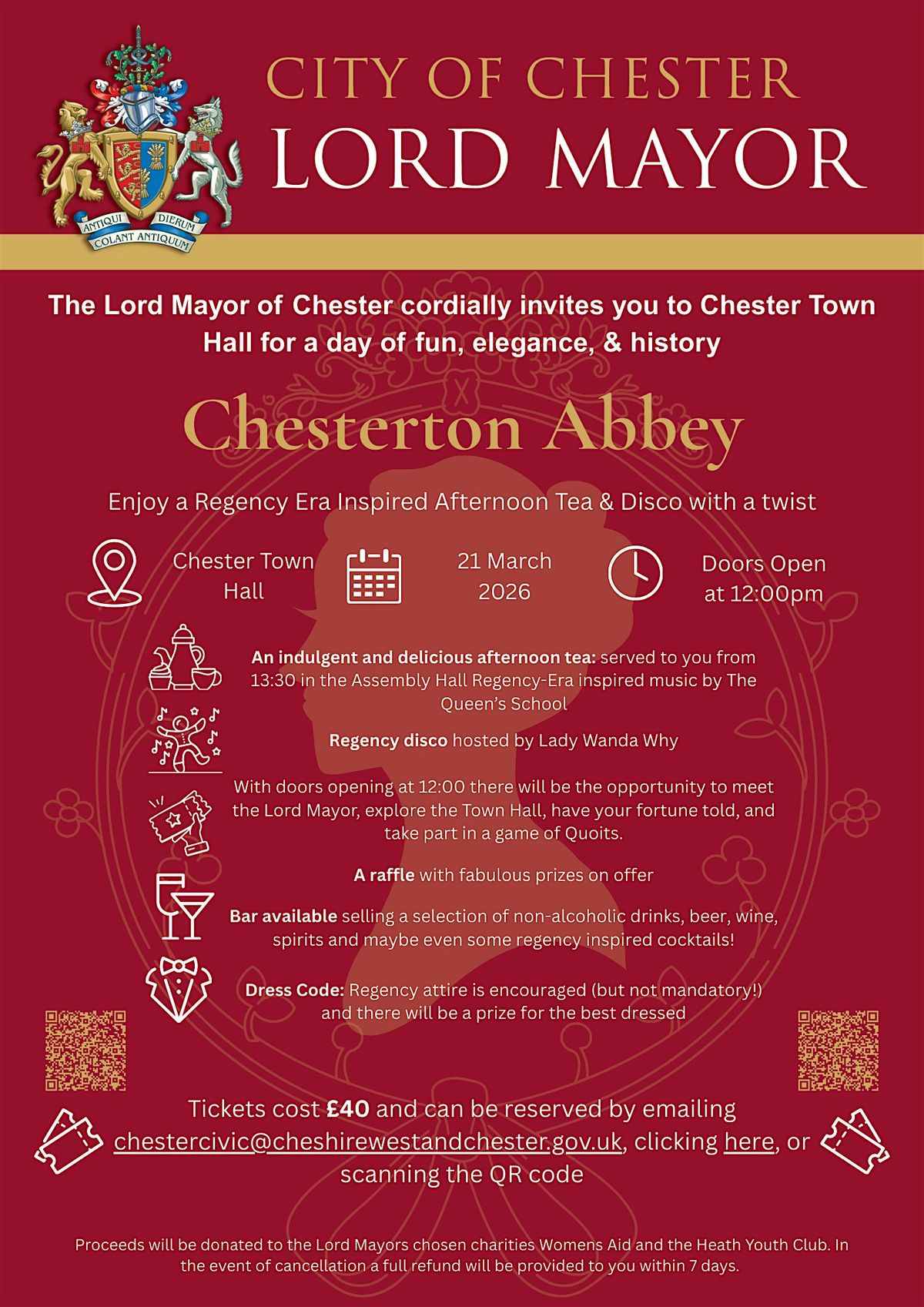 The Lord Mayor of Chester warmly invites you to experience the charm and sophistication of the Regency era as Chester Town Hall transforms itself into Chesterton Abbey a stunning setting for an unforgettable charity event.