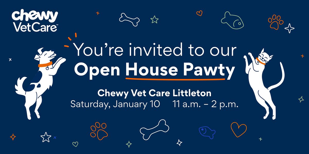 You're invited to help us celebrate the grand opening of Chewy Vet Care's newest Colorado practice at our Open House Pawty on Saturday, January 10, 2026. This is a complimentary event for pets and their people! Stop by from 11am-2pm to meet our passionate and friendly care team, and enjoy: