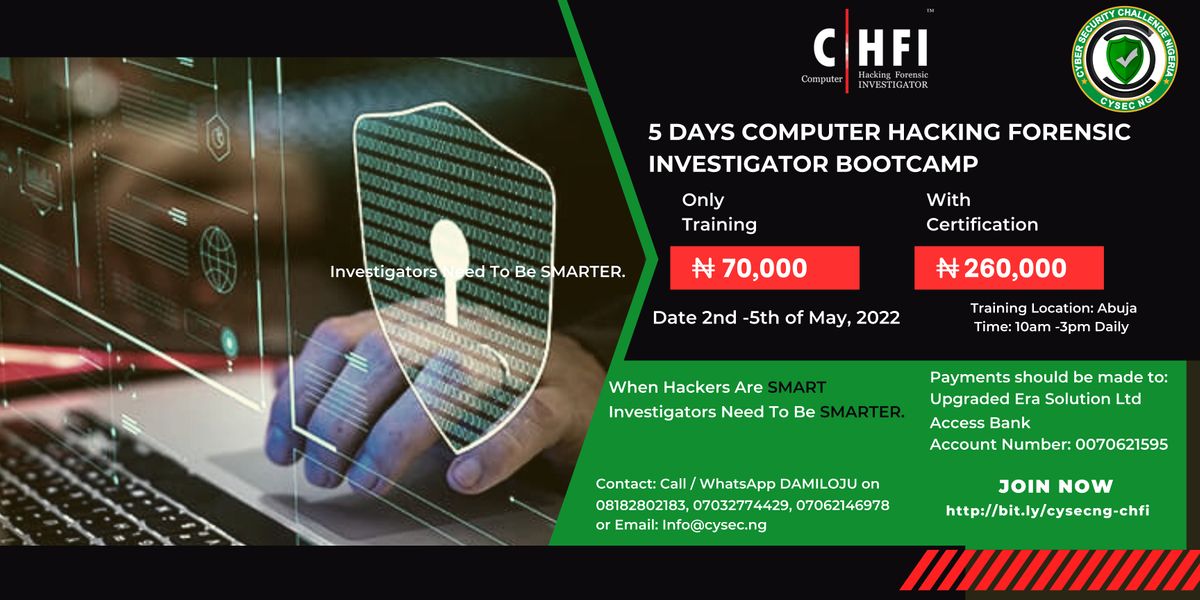 For details on CHFI visit https://www.cybersecuritychallenge.com.ng/events/computer-hacking-forensic-investigator/