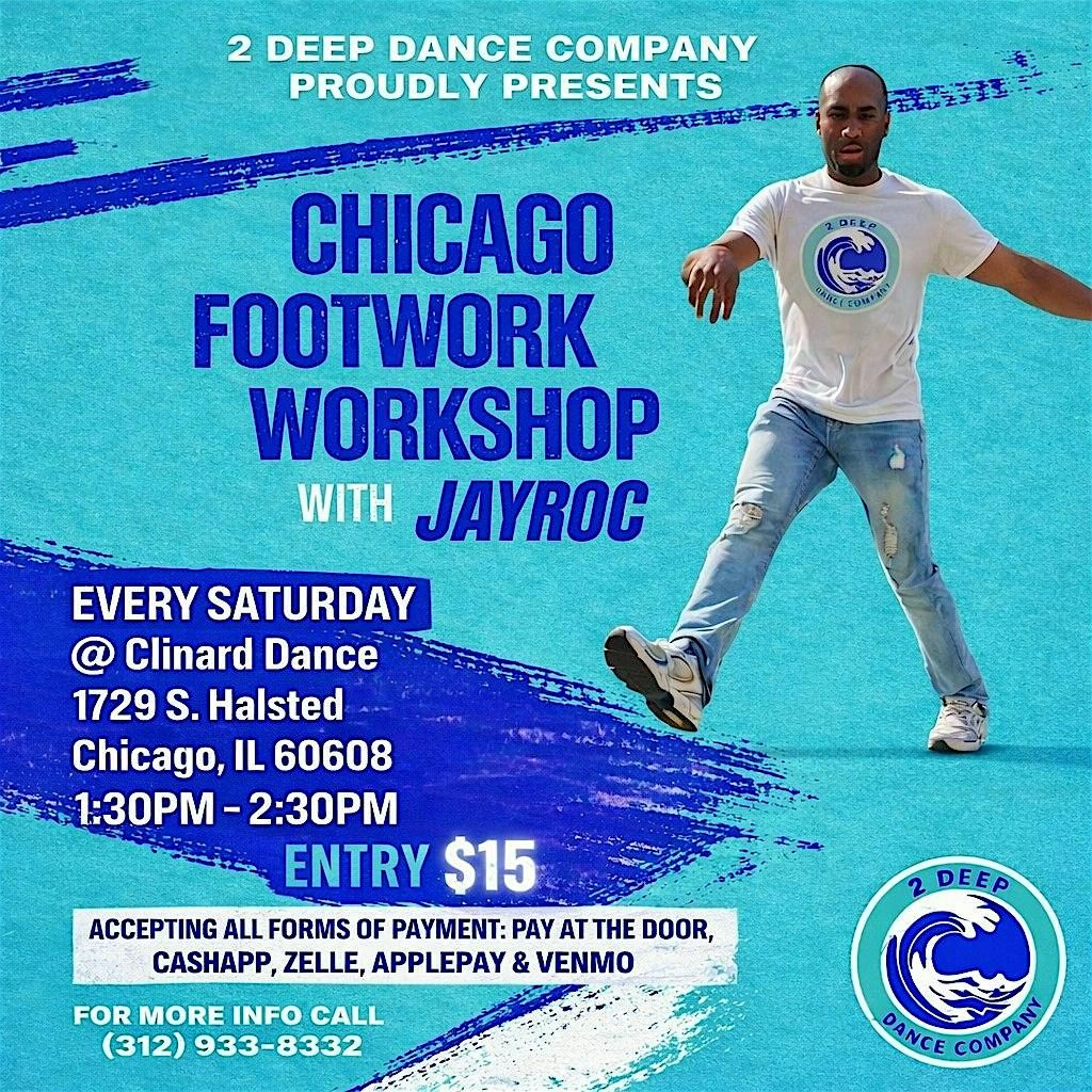 The Chicago Footwork Workshop with Jay Roc is a dance class event focused on teaching the fundamentals of Chicago footwork—a fast-paced street dance style rooted in the city’s juke music culture. Led by dancer Jay Roc and organized by 2 Deep Dance Company, the workshop typically runs about an hour, is open to all ages, and takes place in person at a studio space in Chicago. Overall, it’s designed as an accessible, beginner-friendly session where participants can learn core footwork techniques, rhythms, and movements associated with this iconic Chicago dance style.
