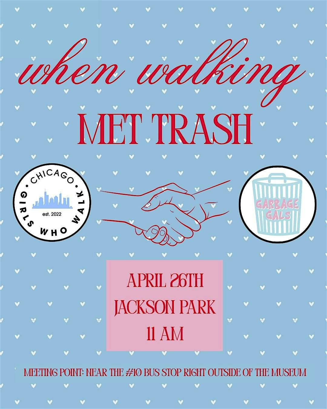 You won't want to miss this collab! We're coming together with Chicago Girls Who Walk to pick up litter during our walk in Jackson Park. Our goal is to clean up the park walking route and make our community shine. It's a perfect chance to meet new gals, enjoy the outdoors, and give back to our planet. All supplies will be provided for you, including gloves, grabbers, buckets, and trash bags. At the end of the route, we will weigh all the litter collected!