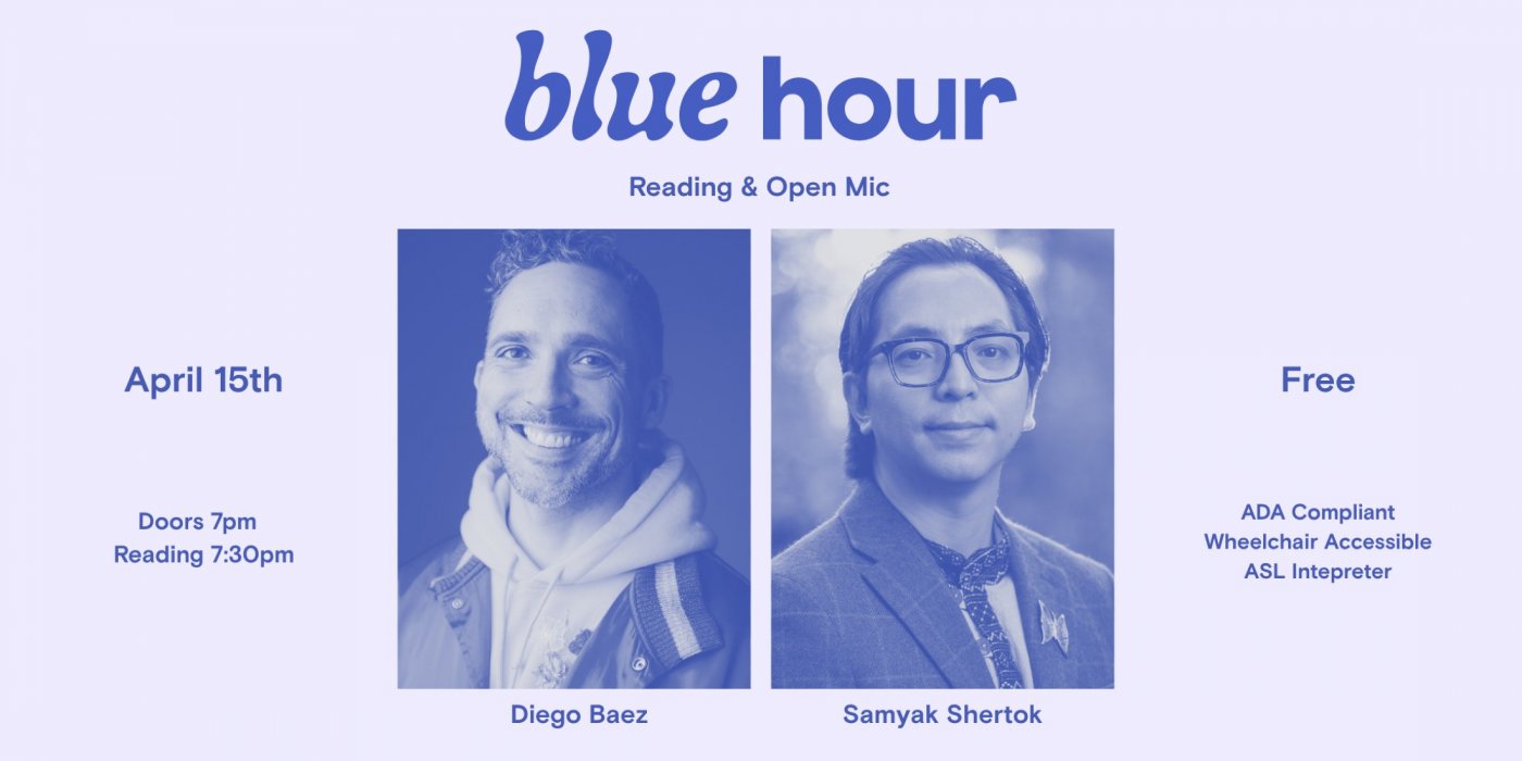 The Chicago Poetry Center presents BLUE HOUR, a free monthly in-person reading series and generative writing workshop. Our April featured readers are Diego Baez and Samyak Shertok.