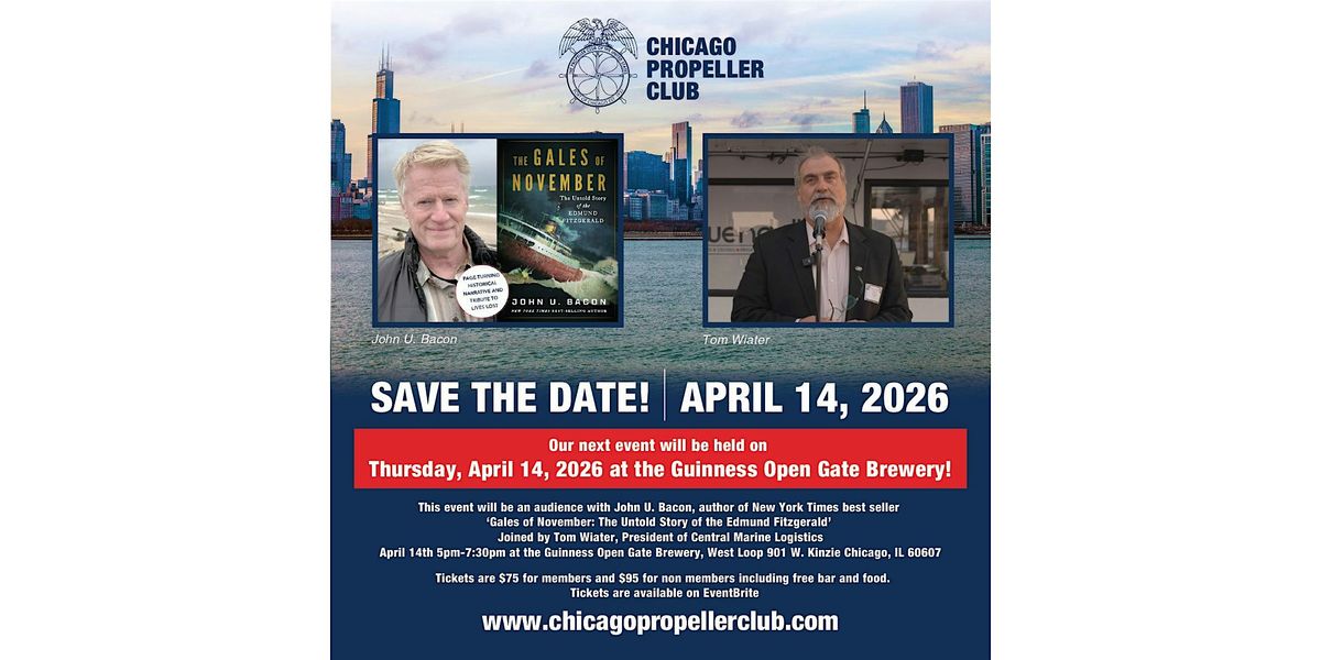 Following the success of our previous events, we are delighted to announce that our next event will be an audience with John U. Bacon author of New York Times best seller Gales of November: The Untold Story of the Edmund Fitzgerald’ in conversation with Tom Wiater (see pic) President of Central Marine Logistics on April 14 5 pm-730pm at the Guinness Open Gate Brewery, West Loop 901 W. Kinzie Chicago, IL 60607.
