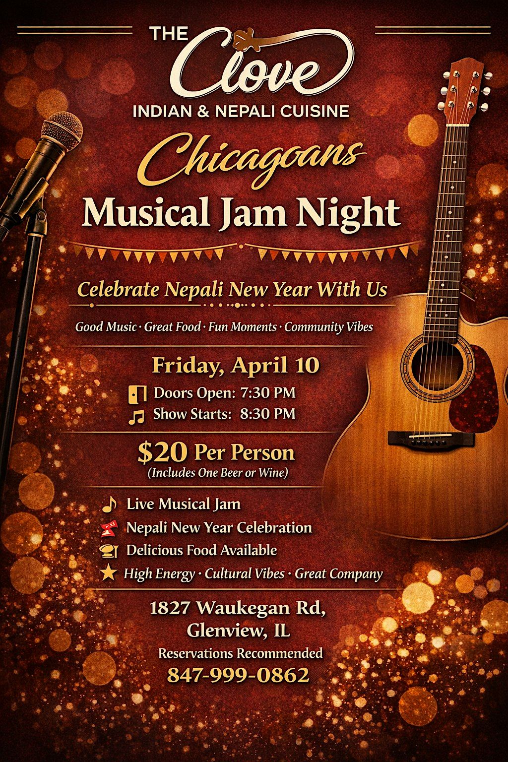 Join us for a fun-filled in-person night where Chicago's music lovers come together! Whether you play an instrument or just love good vibes, this jam session is for you. Plus, we're celebrating the Nepali New Year with great company and festive cheer. Don’t miss out on this unique blend of culture and music. Bring your friends, your energy, and let's make some memories!
