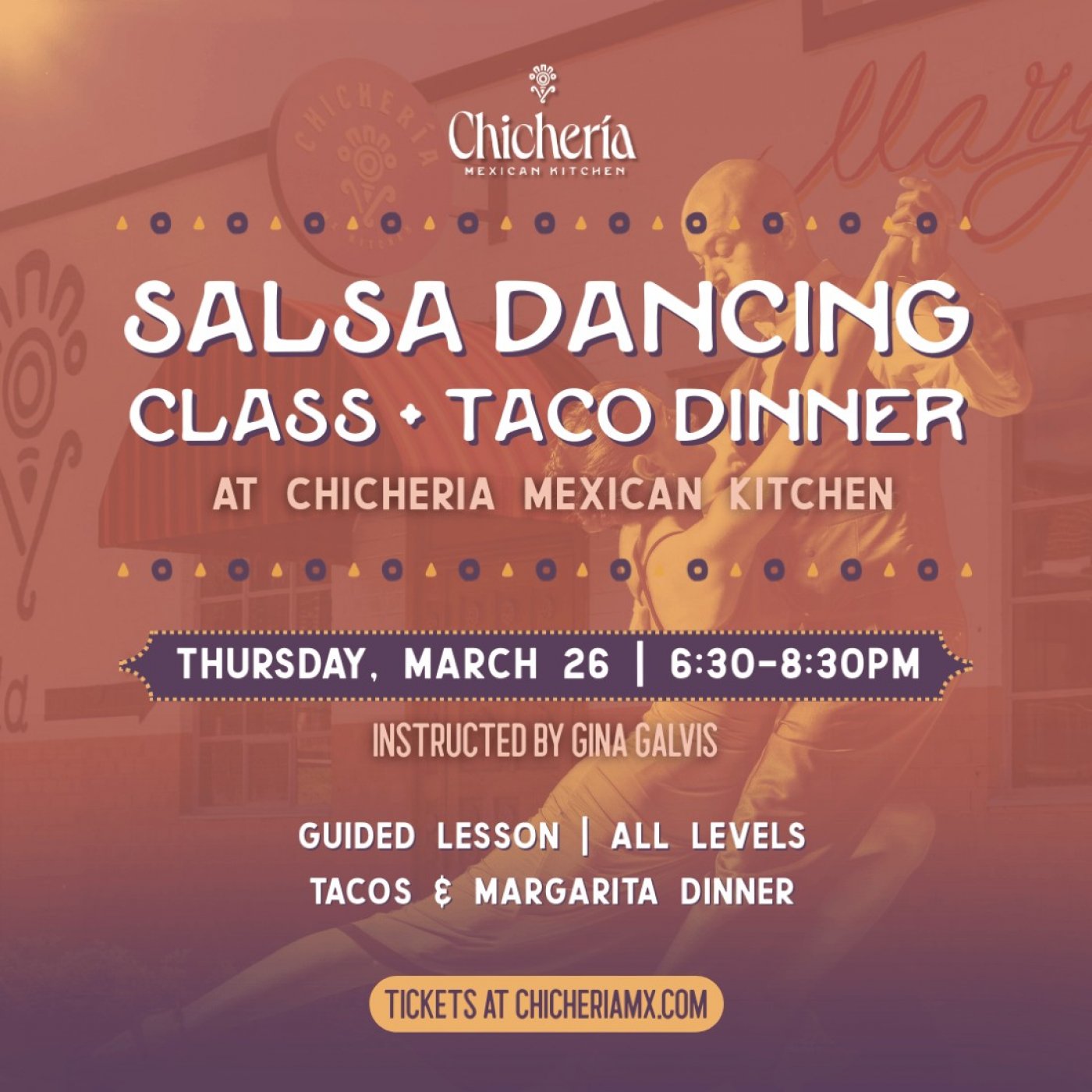 Chicheria Mexican Kitchen invites you to the Salsa Dancing Class + Taco Dinner on Thursday, March 26, from 6:30pm to 8:30pm. Join us for an evening of tacos, margaritas, and an all-level dancing experience under the evening sky.