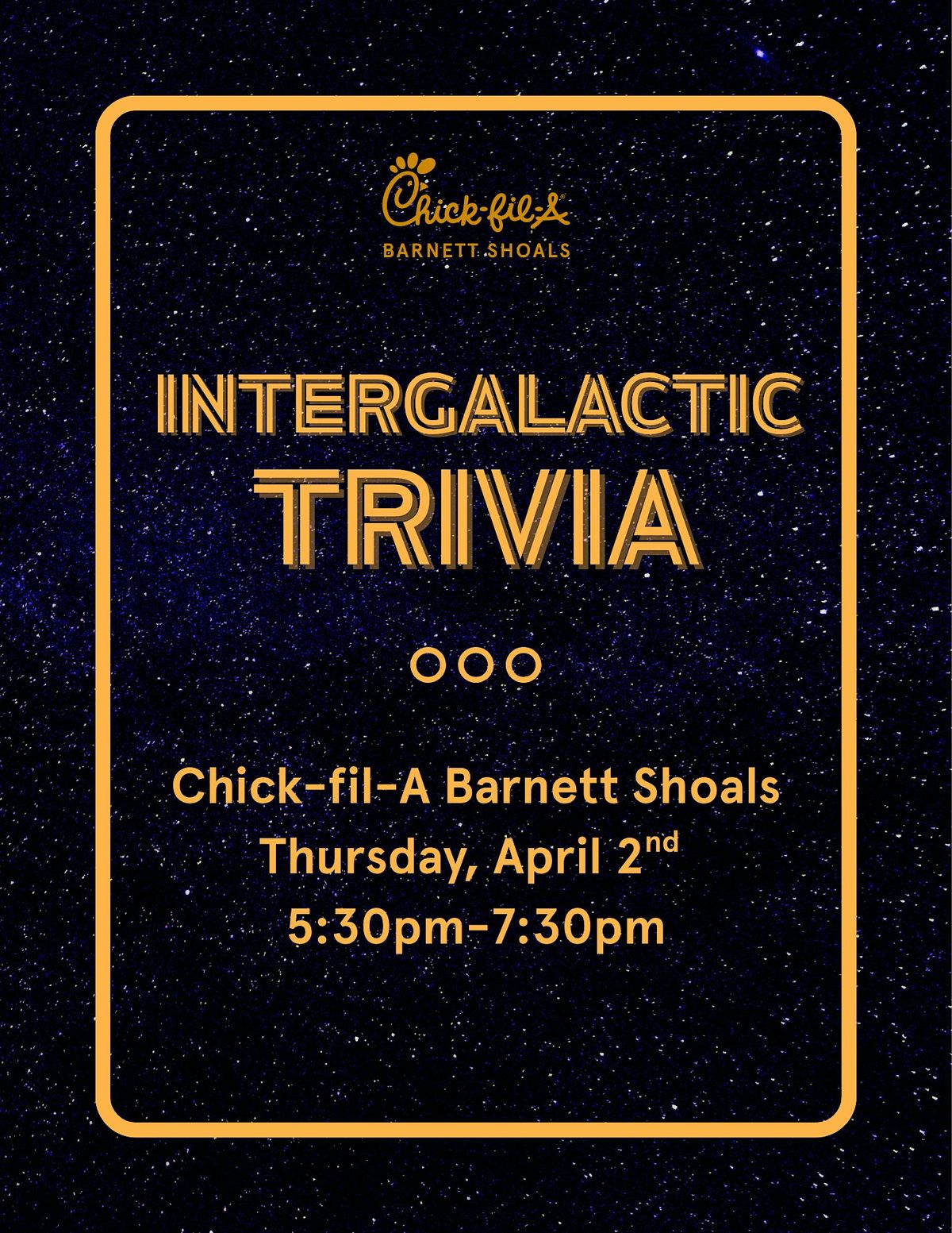 Join us for Intergalactic Trivia Night at Barnett Shoals on April 2nd from 5:30 PM - 7:30 PM! 🚀✨