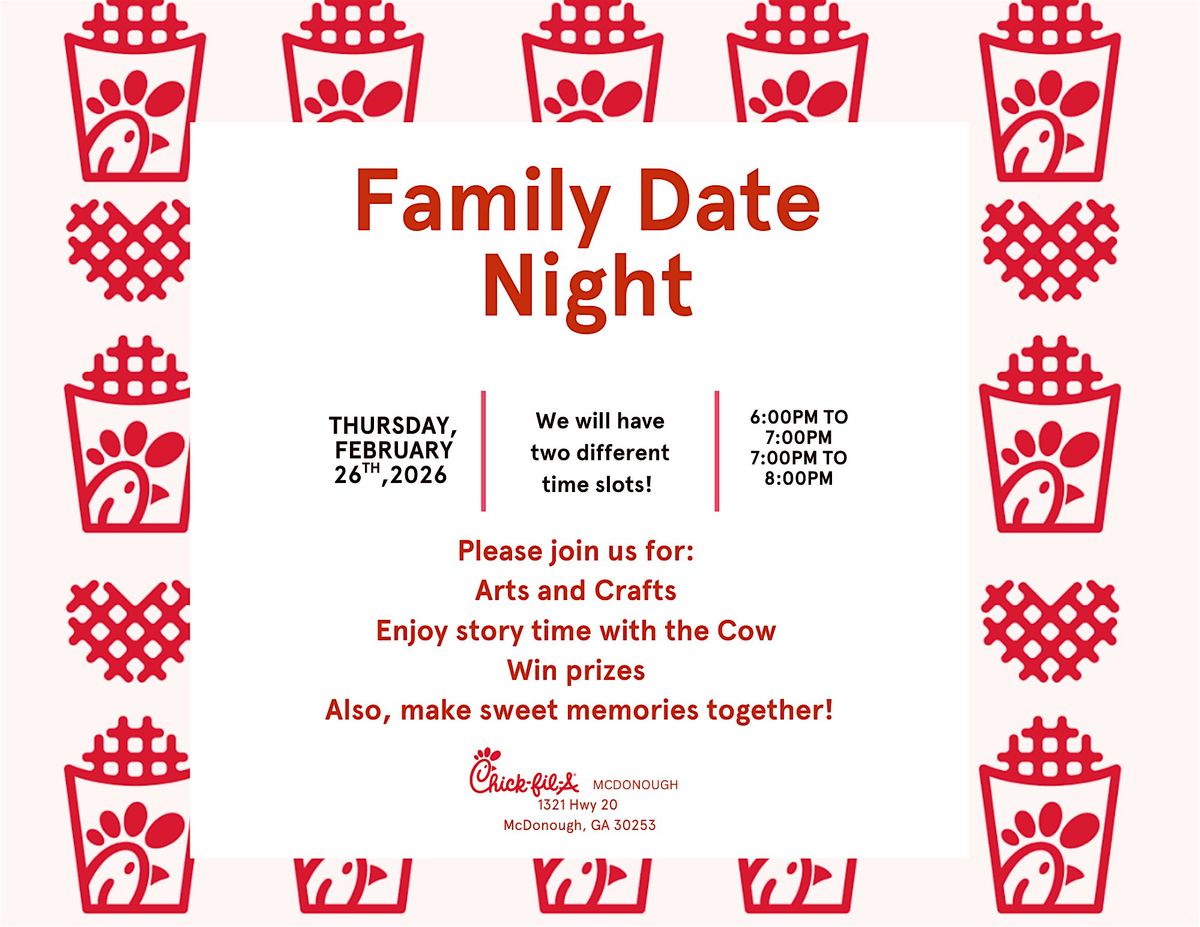 Join us for a fun, family-friendly event filled with creativity, laughter, and special moments! Guests will enjoy hands-on arts and crafts, story time with the Chick-fil-A Cow, opportunities to win prizes, and plenty of time to make sweet memories together. This event is perfect for families looking to spend quality time in a warm, welcoming atmosphere while enjoying interactive activities for all ages. Come join the fun—we can’t wait to see you there! 🐮🎨🎁 Tickets are $5.00 dallars per child!