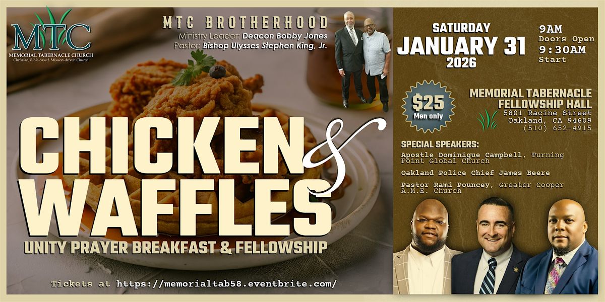Chicken & Waffles is a time to empower men to care for themselves as they lead and lift others! It is hosted by Deacon Robert "Bobby" Jones, MTC Brotherhood Leader and covered by Bishop Ulysses Stephen King, Jr. , Senior Pastor.