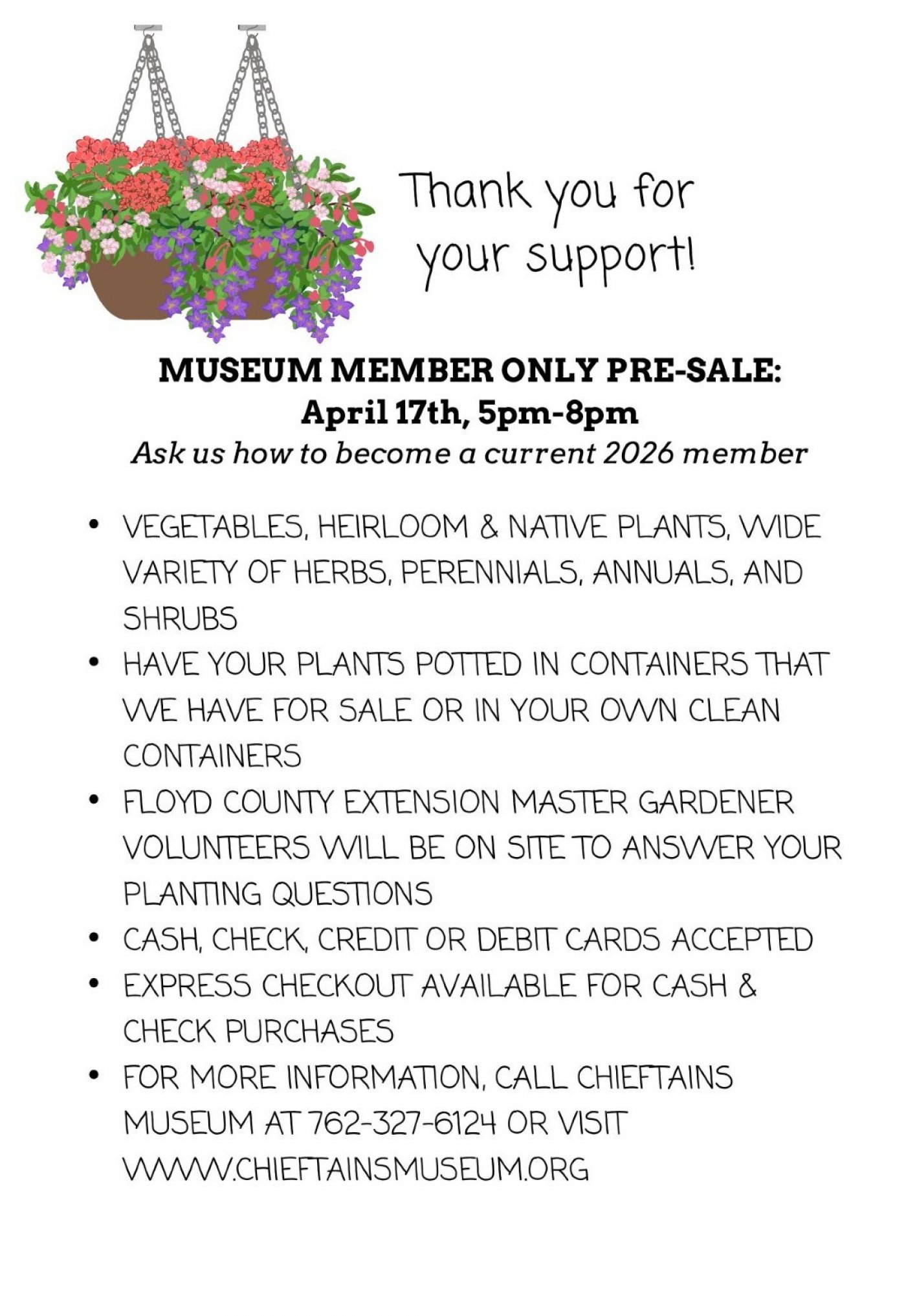 Save the date for our annual Herb & Plant Sale! Our Members Only Pre-Sale will be Friday, April 17 from 5-8pm. The plant sale will be open to the public on Saturday, April 18 from 9am-4pm and on Sunday, April 19 from 12-3pm. We will have vegetables, heirloom, and native plants as well as a variety of herbs, perennials, annuals, and shrubs! The Floyd County Master Gardener volunteers will be on site to answer your planting questions. Cash, check, credit or debit cards are accepted with an express checkout available for cash and check purchases. For more information, call the museum at (762) 327-6124 or visit our website at www.chieftainsmuseum.org.
