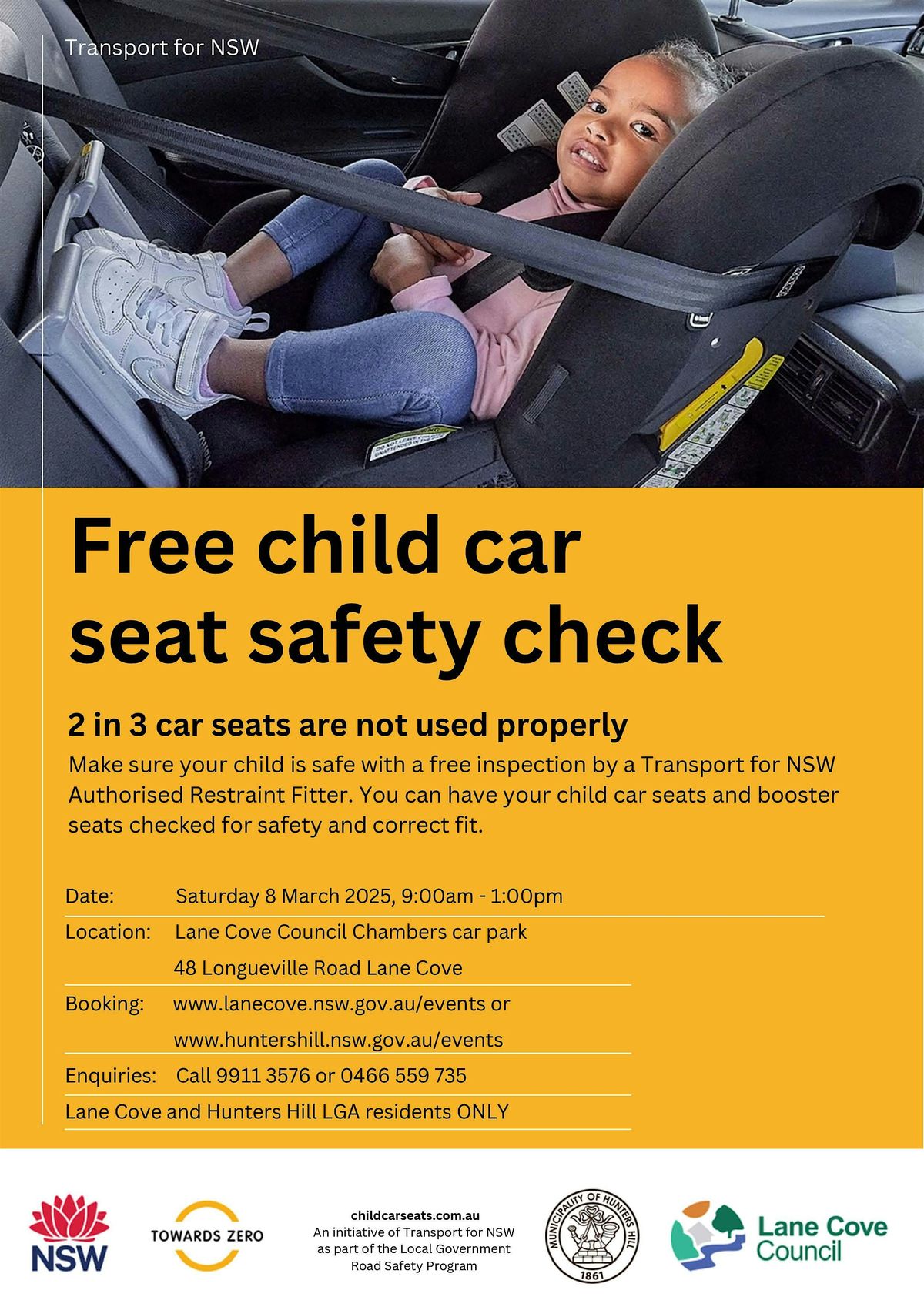 When do I need to have my existing car seats adjusted, relocated or switched from rear to forward facing? Can I have a brand new child seat installed? Can I have my car seats swapped from one vehicle to another? Can I purchase parts for my seats? All your questions can be answered by our team of expert, authorised Transport for NSW fitters. Join us at our Lane Cove Council Child Car Seat Safety Checking Clinic. Make a booking for Saturday 28 June 2025 between 9:00am and 1:00pm at Lane Cove Council Chambers car park. Ensure your most precious of cargo is safe!
