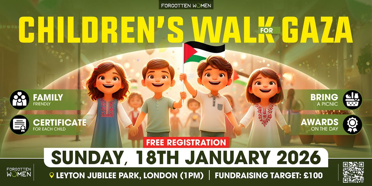 Join us on Sunday, 18th January 2026 for a meaningful Children’s Walk for Gaza at Leyton Jubilee Park, London hosted by Forgotten Women. Little feet will take big steps as children and families walk in solidarity with the children of Gaza, helping raise awareness and support for urgent humanitarian aid.