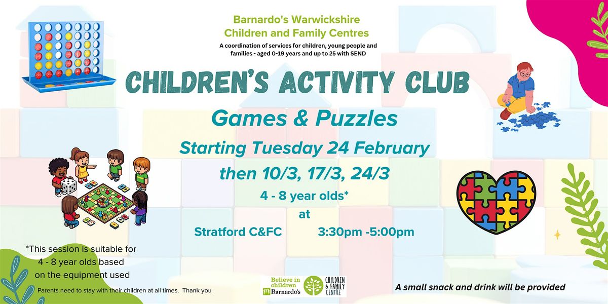 You will have the opportunity to develop you and your children’s skills in playing games and solving puzzles. All children must be accompanied by an adult. Younger siblings welcomed!