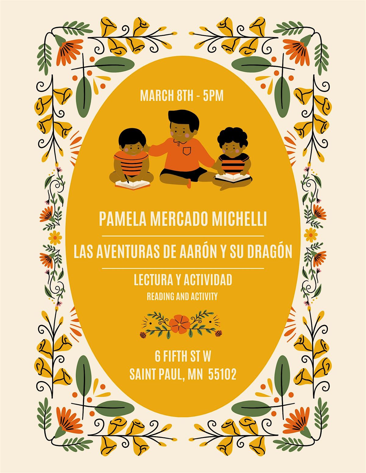 Join us at Subtext Books, 6 West 5th Street, St. Paul, MN 55102 on March 8th at 5 PM for a book event and childrens activity centering Las Aventuras de Aarón y su Dragón by Pamela Mercado Michelli.