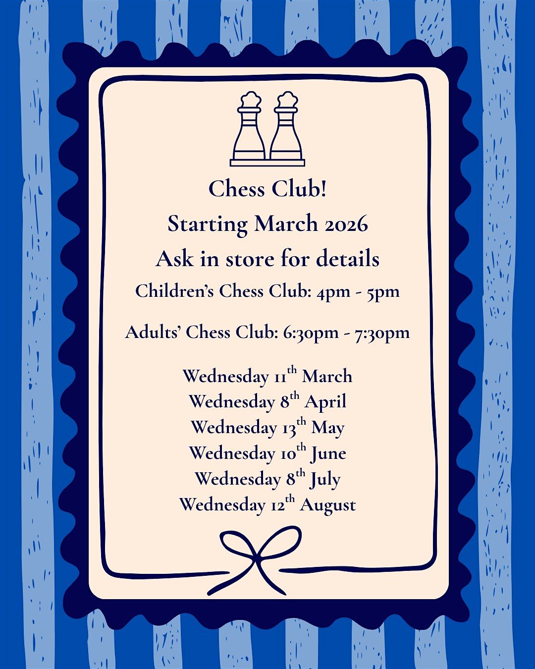 Our chess set in the bookshop has been so popular that we've decided to hold a monthly chess club in store! We've loved seeing so many of you visit us for a game of chess with family and friends, and we thought it would be a nice idea to have multiple sets available for you to play with fellow chess players!