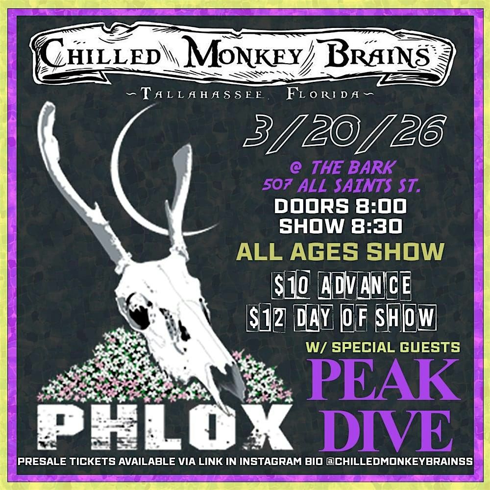 CHILLED MONKEY BRAINS return to Tallahassee in support of their 3rd full length vinyl album "BACK TO THE MUD" along with locals PHLOX and PEAK DIVE!