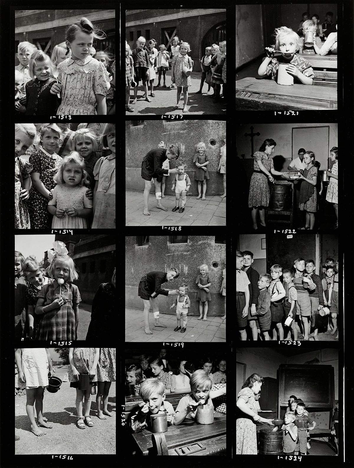 [1] David "Chim" Seymour, [Food Distribution, Unidentified Location], 1948, gelatin silver print (contact sheet, detail). The Image Centre, Gift of Ben Shneiderman, 2022 © David Seymour Estate/Magnum Photos