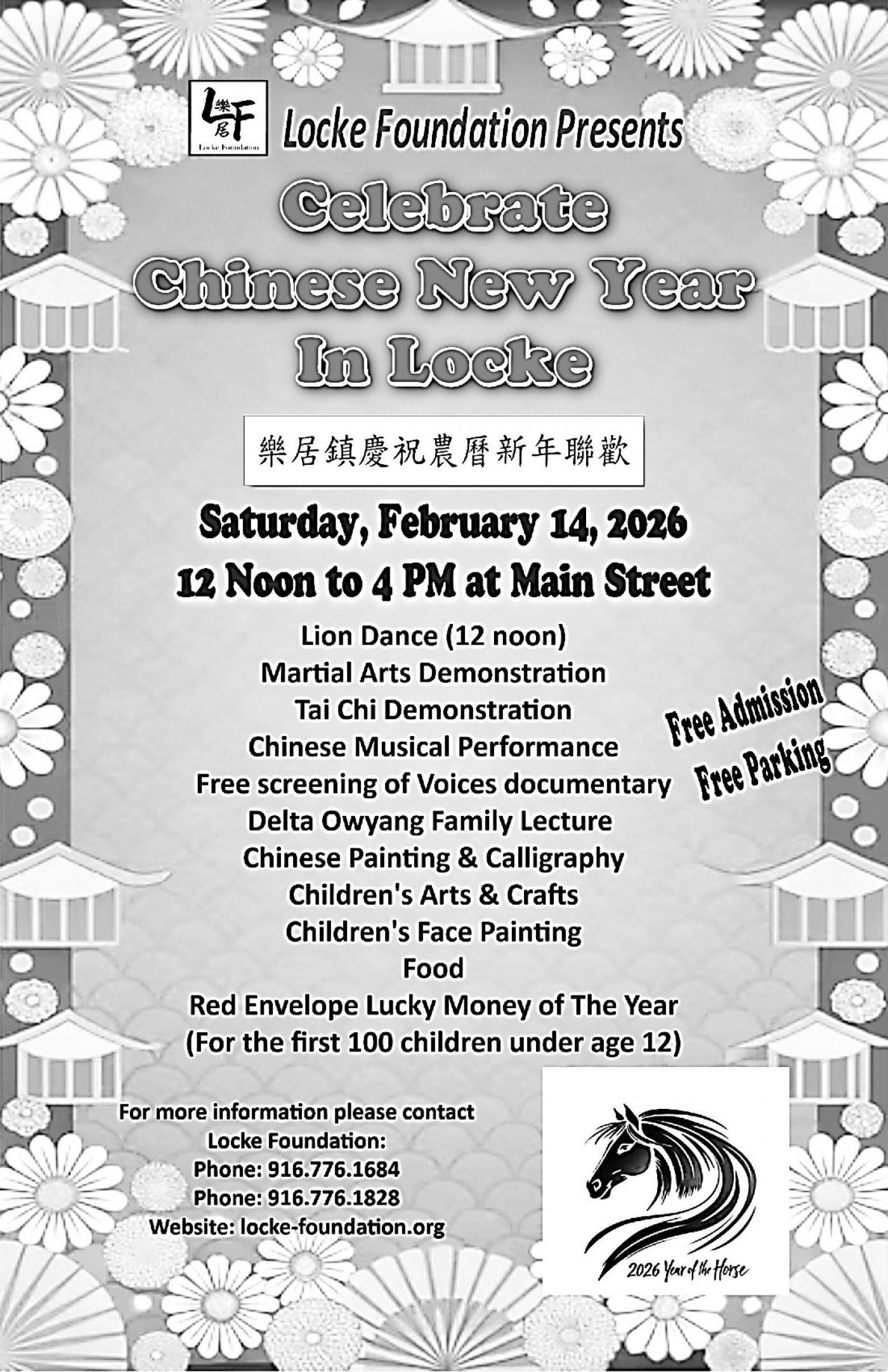Chinese New Year will be celebrated in Locke Chinatown on Sat February 14. [Lunar New Year is actually on Feb. 17, Year of the Horse.] FREE admission, FREE parking. Locke is the last remaining rural Chinatown in the US. Lion dance (12 noon), Martial arts demonstration, Tai chi demonstration, Chinese musical performance, Showing of documentary film Voices: Women of the Delta, Delta Owyang Family lecture, Chinese painting and calligraphy, Children's arts and crafts, Children facepainting. Red envelope lucky money to first 100 children under age 12.