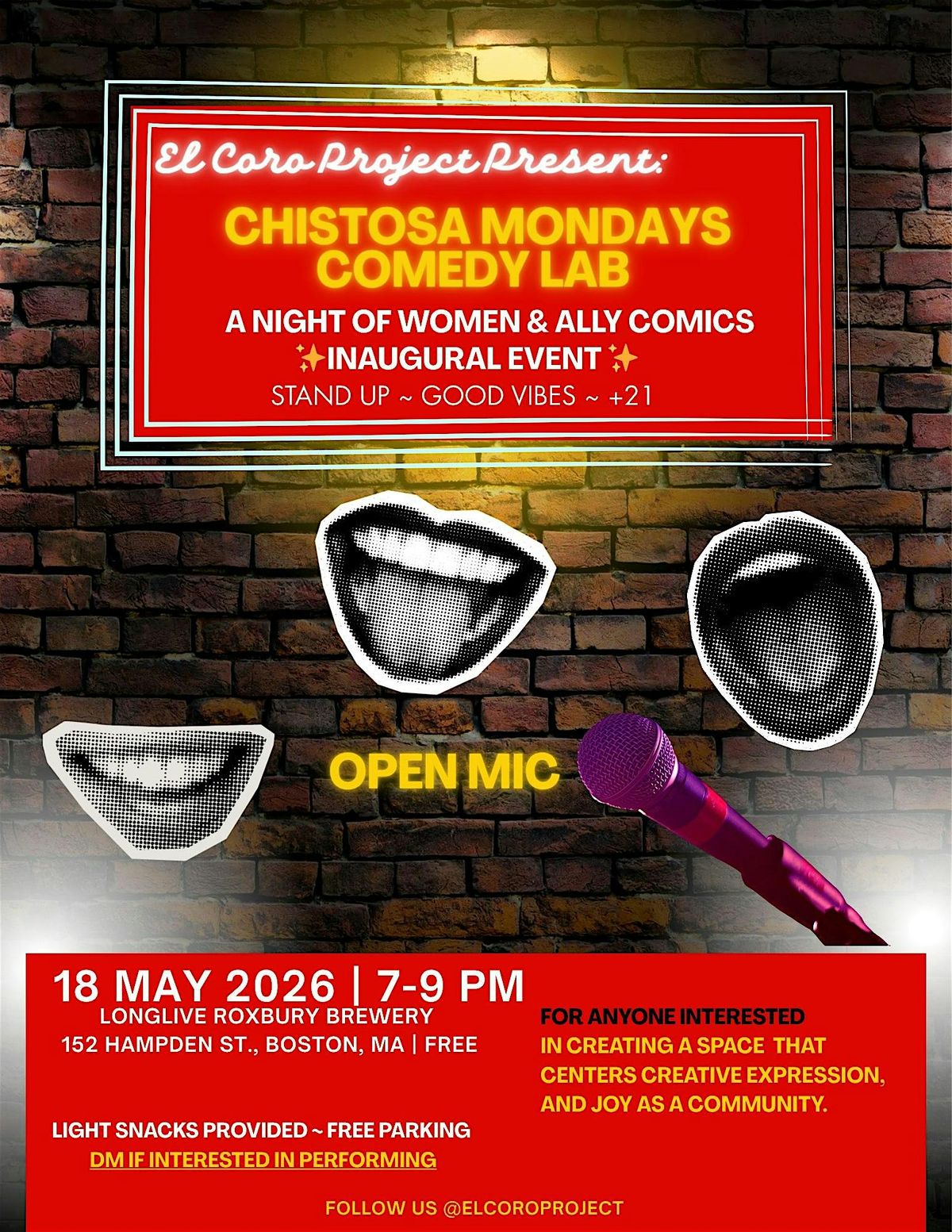 ¡Prepárate para reír a carcajadas con Chistosa Mondays Comedy Lab! Este evento presencial es el plan perfecto para arrancar la semana con buen humor y mucha diversión. Ven a disfrutar de talentosas comediantes y su humor fresco, en un ambiente relajado y súper divertido. No te lo pierdas, trae a tus amigos y déjate contagiar por las mejores risas del lunes!