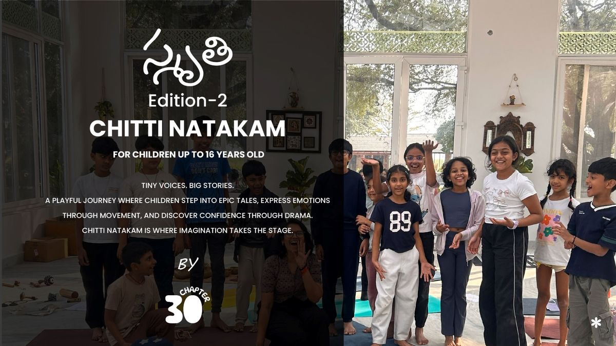 Drama & Storytelling for ChildrenSuitable for those aged 8 to 16 yearsPresented by స్మృతి (Smruthi) – Edition 2Chitti Natakam invites children to explore stories, movement, and feelings through drama inspired by Indian epics. Here, epics become play, and emotions find a voice.This immersive workshop invites children to explore their inner world through the grand canvas of Indian epics. Using the vibrant tools of Drama, Storytelling, and Movement, kids step into the roles of heroes and characters, learning emotional awareness and self-expression through play.Conducted by Advaya Yoga Studio, the session focuses on confidence, empathy, and creative expression.📖 Drama | Storytelling | Emotional Intelligence🌈 Helping kids find their voice on the stage of life