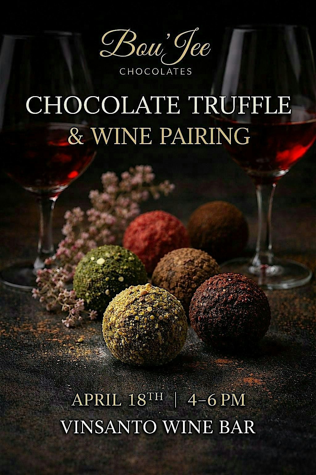 VinSanto Wine is teaming up with Bou’Jee Chocolates for a one night only $55 Chocolate and Wine Pairing.