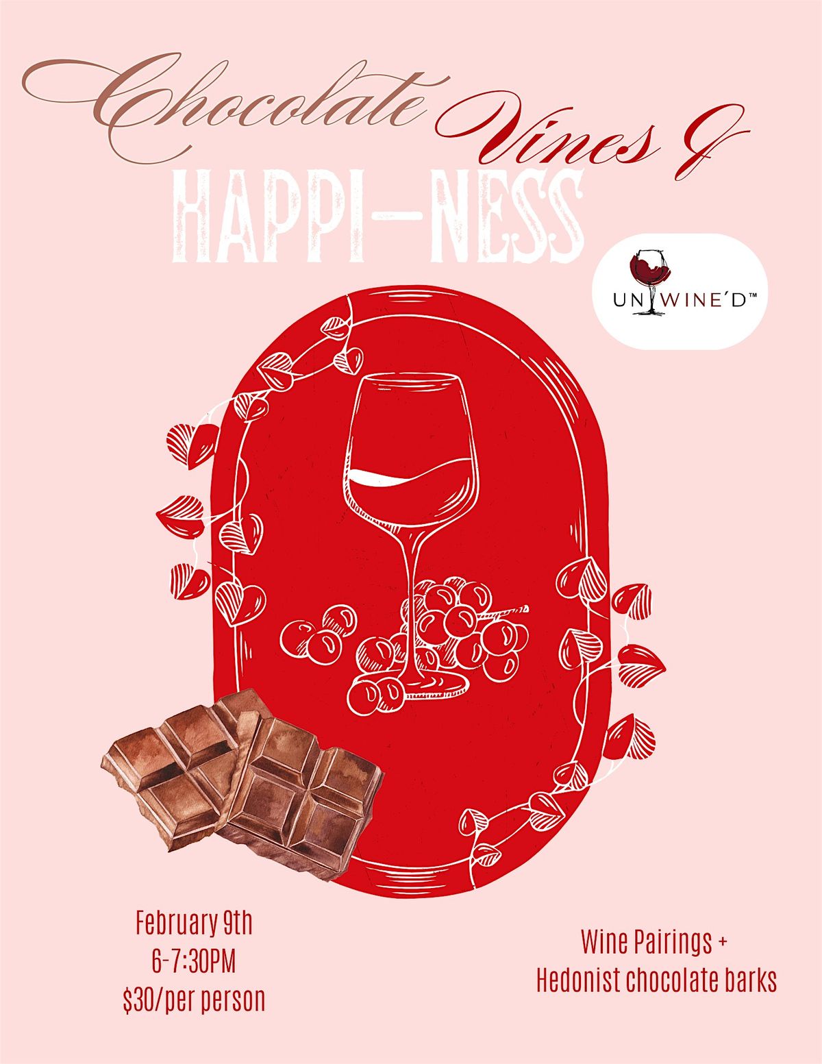 Unwine’d is partnering with Hedonist Artisan Chocolates to bring you an exclusive wine and chocolate pairing experience designed for friends and foodies alike. Whether you're celebrating with a partner or enjoying a "Galentine’s" night out, join us to explore how expertly selected wines elevate the complex notes of handcrafted artisan chocolates.