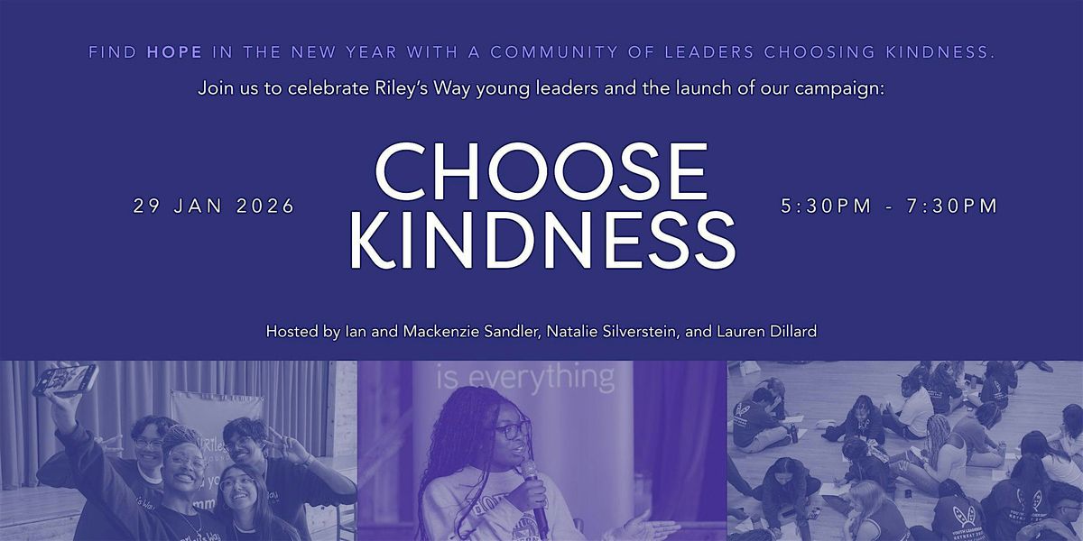 Join us for an inspiring evening as we kick off Riley’s Way’s Choose Kindness Campaign and celebrate the young leaders who are redefining what leadership can look like. Hear directly from Riley’s Way students, connect with a community committed to empathy and impact, and help launch a campaign rooted in hope, kindness, and action.