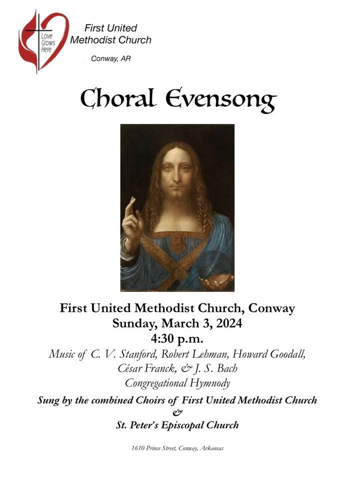 The Music Departments of First United Methodist Church and St. Peter’s Episcopal Church, Conway invite you to attend choral evensong on Sunday, March 3, 2024, 4:30 p.m. at First United Methodist Church, Conway, 1610 Prince Street. Evensong will be sung by the combined choirs of First United Methodist and St. Peter’s.