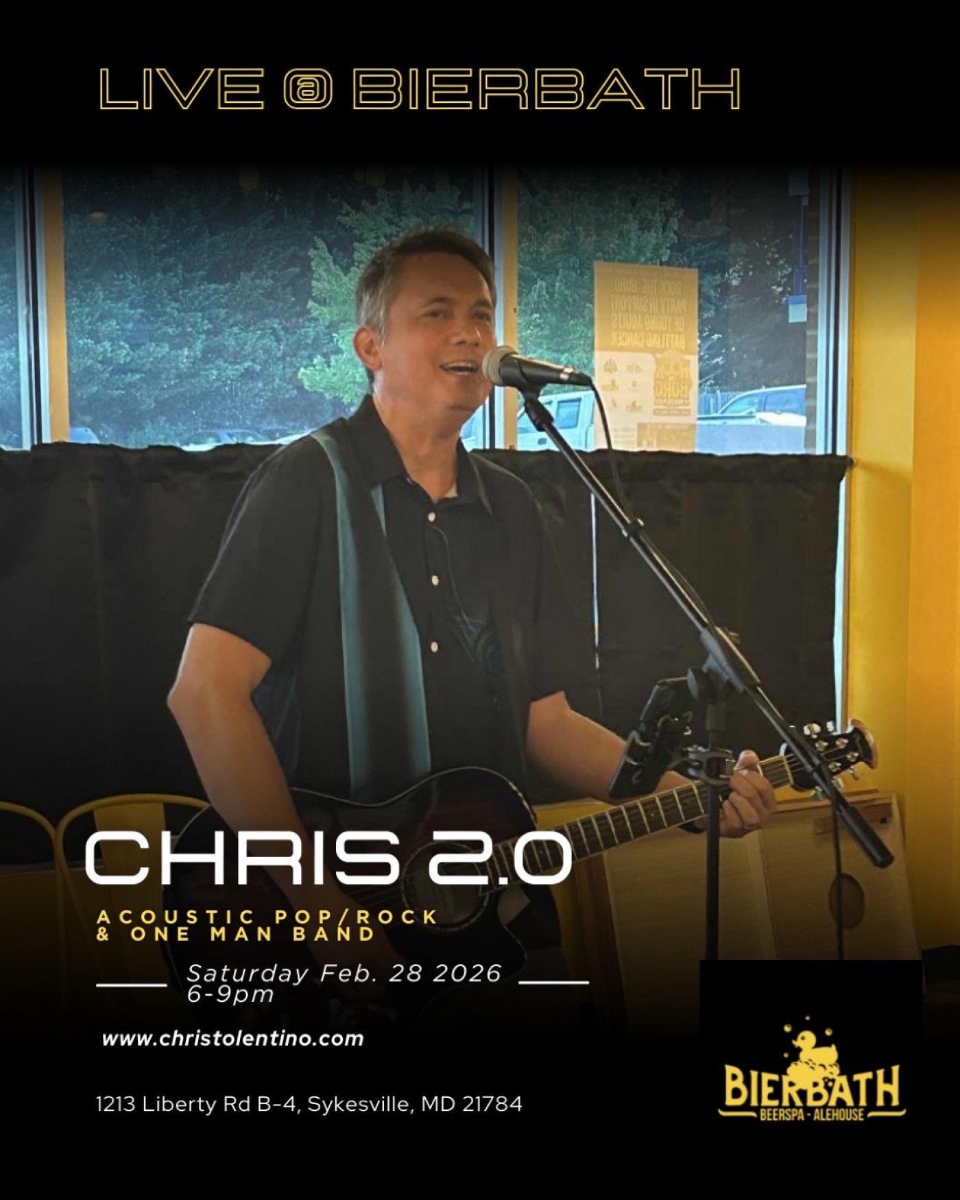 Enjoy Live music by Chris Tolentino aka Chris 2.0 former vocalist and musician for the Alternative Rock bands Airwaves Spectacular and SmudgeProof! Covering a variety of songs from the 60s 70s 80s 90s etc.