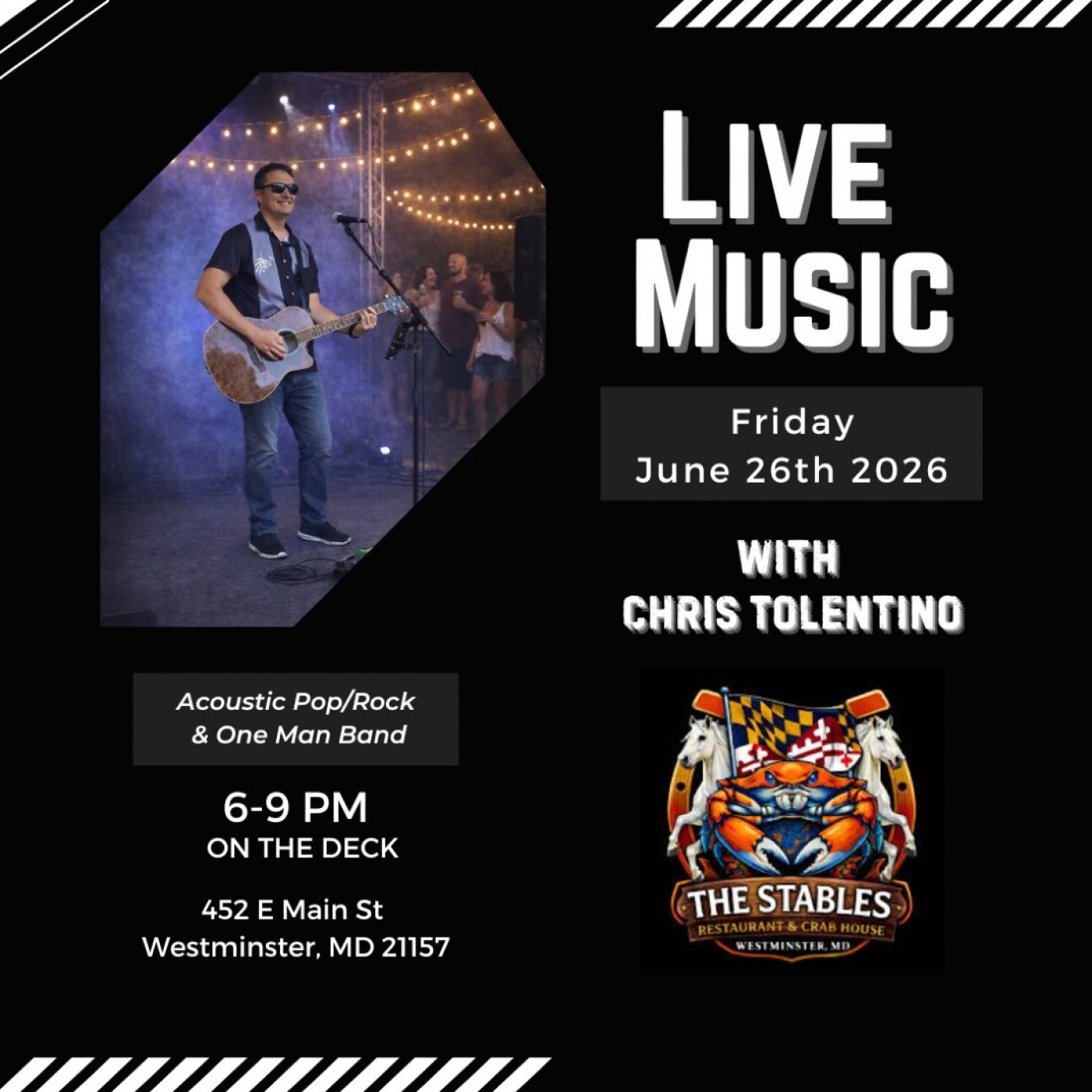 Enjoy Live music by Chris Tolentino aka Chris 2.0 former vocalist and musician for the Alternative Rock bands Airwaves Spectacular and SmudgeProof! Covering a variety of songs from the 60s 70s 80s 90s etc