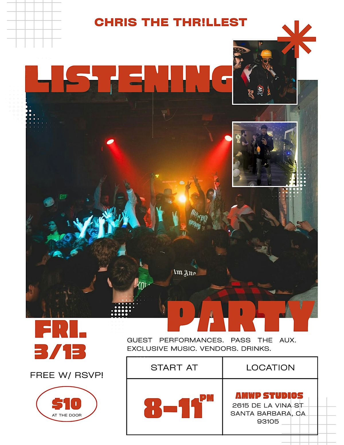 Exclusive tracks. Guest Performances. Vendors. Drinks. Free Entry w/ RSVP! $10 At The Door.
