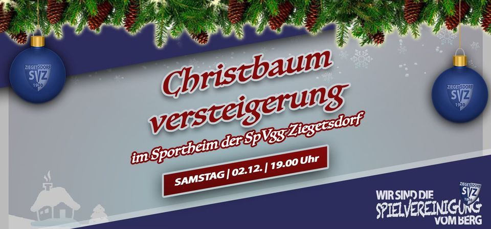 Wie jedes Jahr lädt die SpVgg Ziegetsdorf zu Beginn der Weihnachtszeit zur traditionellen Christbaumversteigerung ein. Erlebt gemeinsam mit uns einen geselligen Abend mit Tombola und Versteigerung von so manch nützlichem Utensil durch unseren Versteigerer Wolfgang Sauerer. Seid dabei und verbringt einen tollen Abend mit uns!