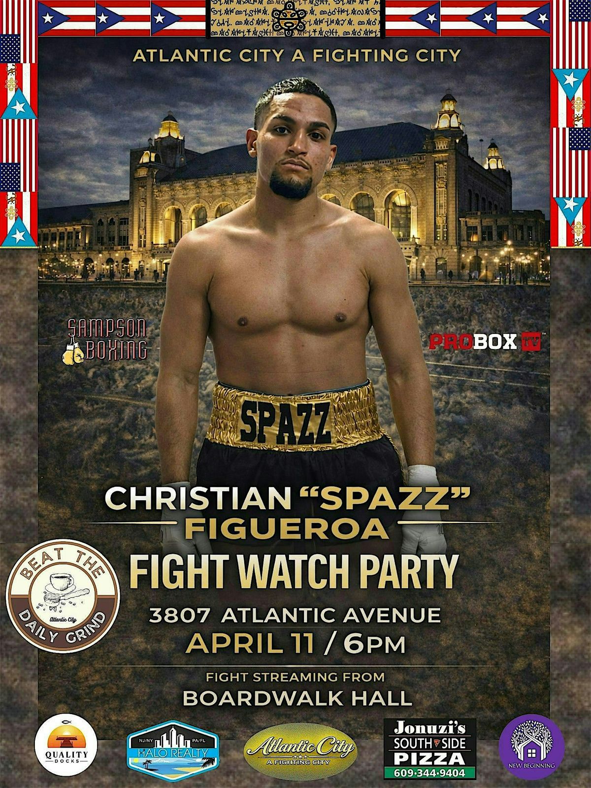 Come out and support Atlantic City’s own Christian “Spazz” Figueroa as he steps into the ring against 5-0 prospect Arian Iseni. This is a big moment — and we’re bringing the energy right here to Beat The Daily Grind with an official Fight Watch Party.
