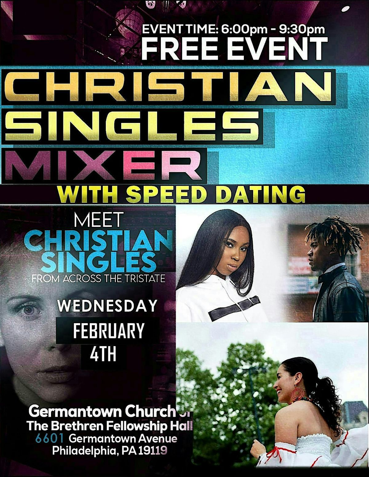 Join Us the 1st Wednesday of February for another Christian Singles Mixer, this time with Speed Dating. We have the funnest Christian Singles Mixers around. We will provide free food and beverages and the entry price is free dollars ( You literally just show up ). Our main objective is for Christians who are ready to meet new people and possibly date, to find each other at our events. Therefore we Always have 'mingling' time where guests can talk and get to know each other. We know you aren't coming jus to listen to a lecture or play a game, this is about meeting new people and we will do that, from 6 to 9:30 pm. Last event nearly was packed, make sure you get there while space is available. See you There!
