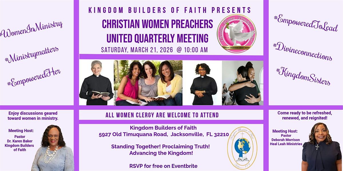 Welcome to the Christian Women Preachers United Quarterly Meeting! Join us on March 21, 2026 at 10:00 AM at Kingdom Builders of Faith, 5927 Old Timuquana Rd, Jacksoville, FL 32210 as we come together to celebrate and uplift each other. This event is a great opportunity to connect with fellow Christian women preachers and share your experiences. Don't miss out on this inspiring gathering! See you there! (Eastern Time)