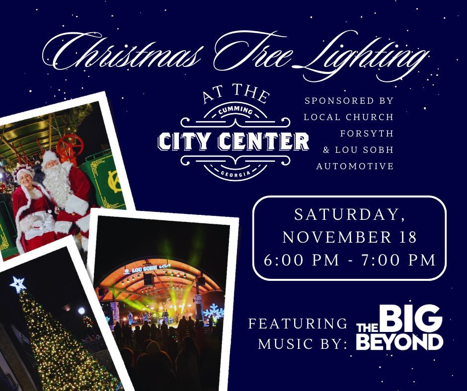Start your holiday season with lots of family-friendly fun at the Cumming City Center on Saturday, Nov. 18th! Following the Winter Market (which will be held from 10 a.m. to 5 p.m. on Nov. 18th), Local Church Forsyth and Lou Sobh Automotive present a Christmas Tree Lighting celebration beginning at 6 p.m. featuring live music from the Big Beyond, family activities, and warm beverages and desserts from local vendors!