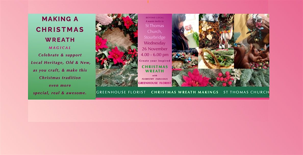 Experience the modern magic of Festive Floristry Your unique Christmas wreath will be tutored under the professional guidance of Stevie Ann - the owner of established The Greenhouse Florist, Stourbridge for over 20 years.