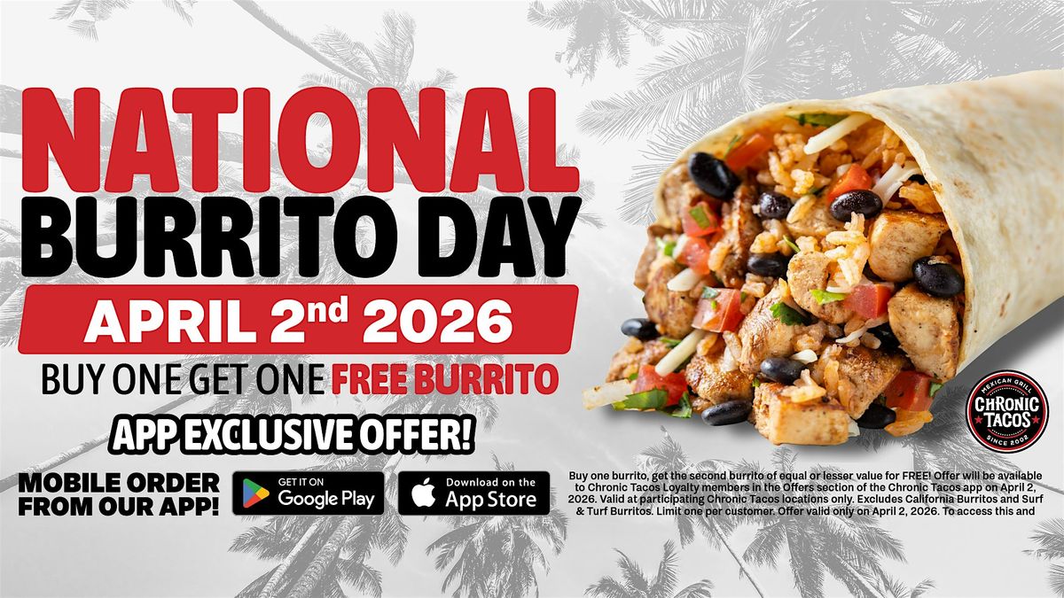 In honor of National Burrito Day on April 2, 2026, Chronic Tacos will offer loyalty members a Buy One, Get One Free burrito available exclusively through the Chronic Tacos App.