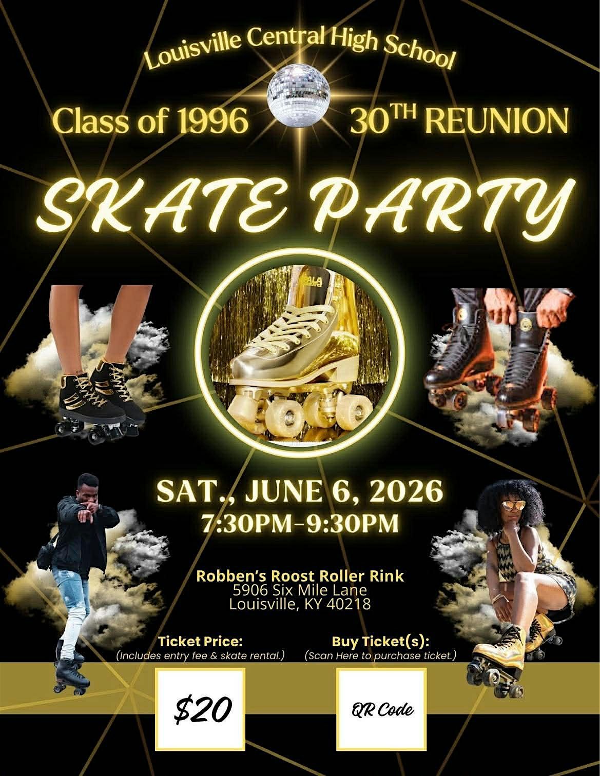 Hey Class of '96! It's time to lace up those skates and roll back into time at our 30 Year Reunion Skating Party. Join us for a fun-filled evening of music, laughter and unforgettable memories made on wheels. Let's reconnect and celebrate three decades of friendships. Don't miss out on the good vibes and good times - let's skate the night away!