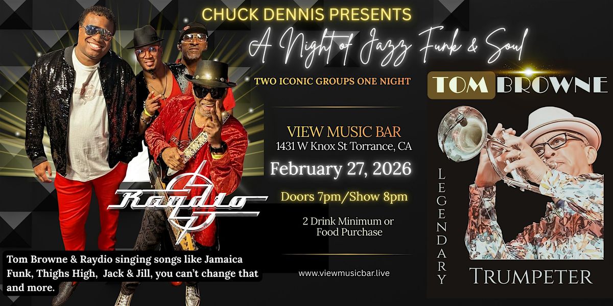 Prepare for an unforgettable musical experience as Chuck Dennis brings together two powerhouse acts for one electrifying evening of world-class entertainment. A Night of Jazz, Funk, and Soul features the legendary trumpeter Tom Browne and the iconic group Raydio with Arnell Carmichael—all taking place at the stylish and intimate View Bar & Lounge.