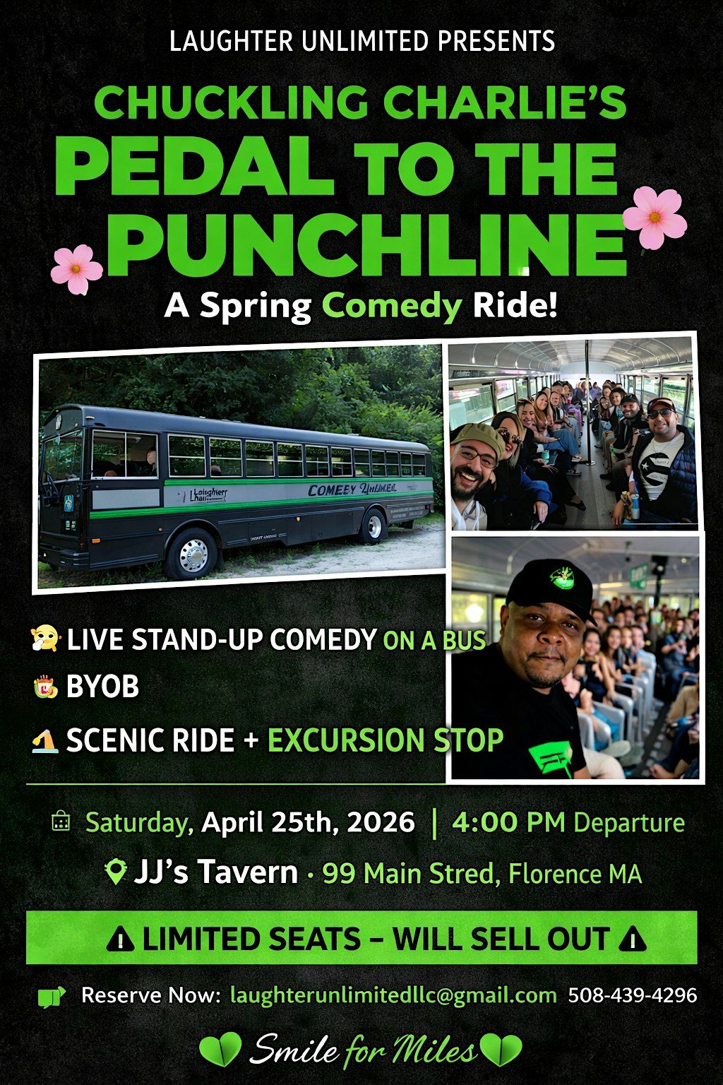 Florence, MA – Shake off the winter blues and hop into spring with a one-of-a-kind comedy experience aboard the Chuckling Charlie Comedy Bus! On Saturday, April 25th at 4:00 PM, Chuckling Charlie’s Pedal to the Punchline rolls out from JJ’s Tavern (99 Main Street, Florence, MA 01062) for an unforgettable afternoon of laughter, good vibes, and springtime fun.