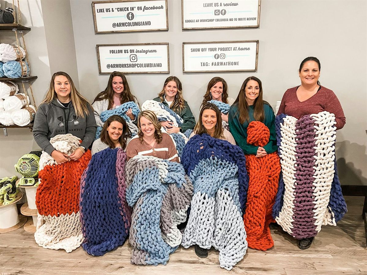 Create a Chunky Knit Blanket with step-by-step instruction! No knitting experience or tools needed. You will choose your yarn colors upon your arrival for this workshop.