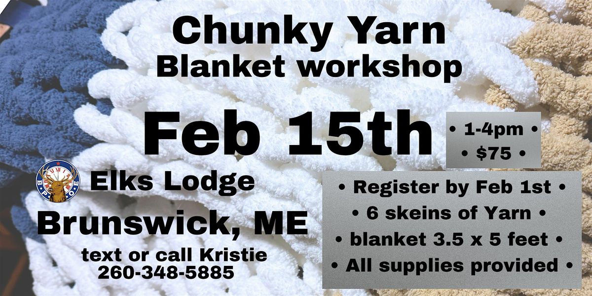 Class runs about 3 hours. You can choose 1,2 or 3 colors of yarn. I will contact you via text for your color choices. Each finished blanket is about 3.5 x 5 feet and includes 6 skeins of chunky yarn.