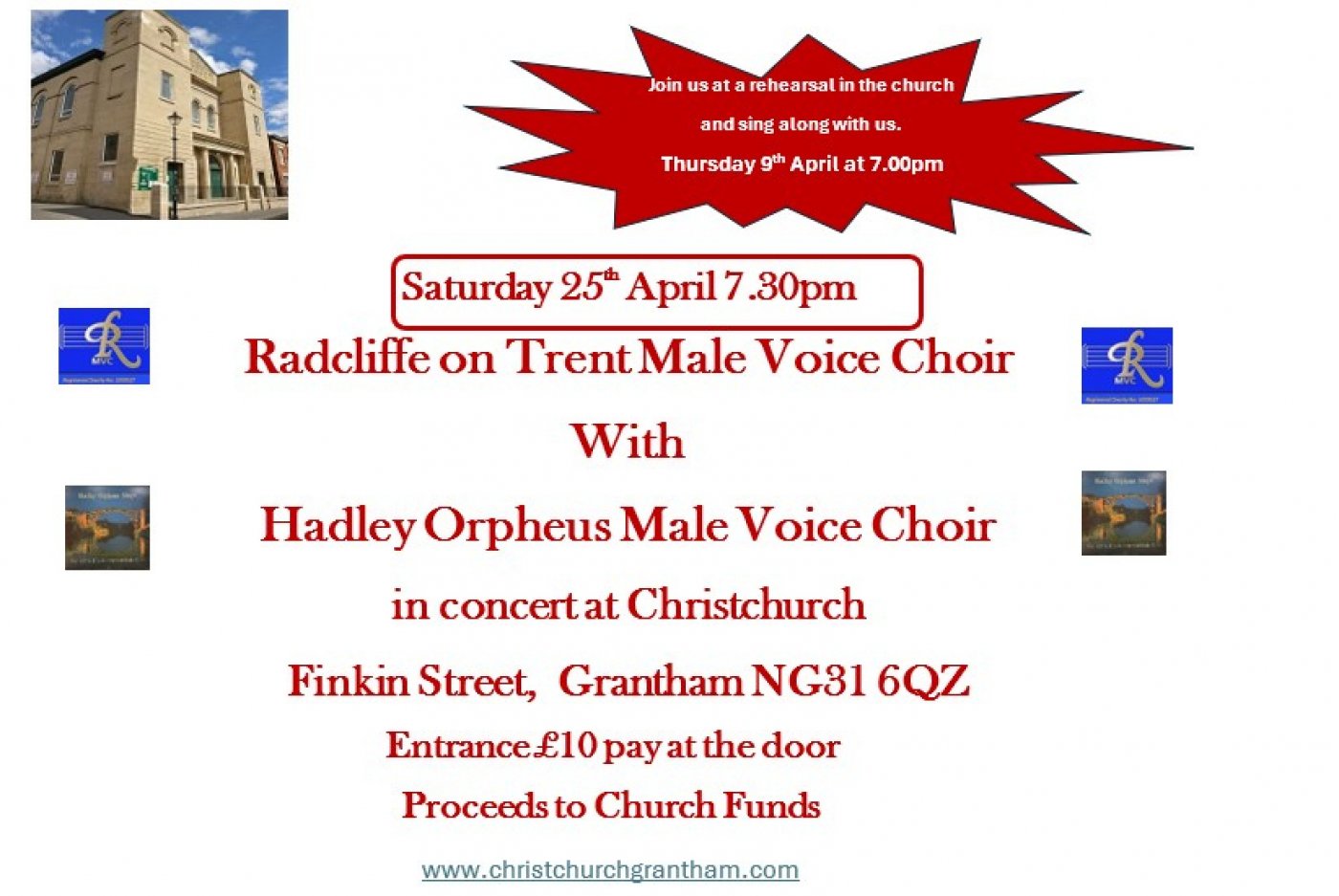 A charity concert to raise funds for Christchurch's community projects. Radcliff on Trent Male Voice choir will join with visitors Hadley Orpheus Male Voice Choir to give three performances - one for each choir and a joint performance.