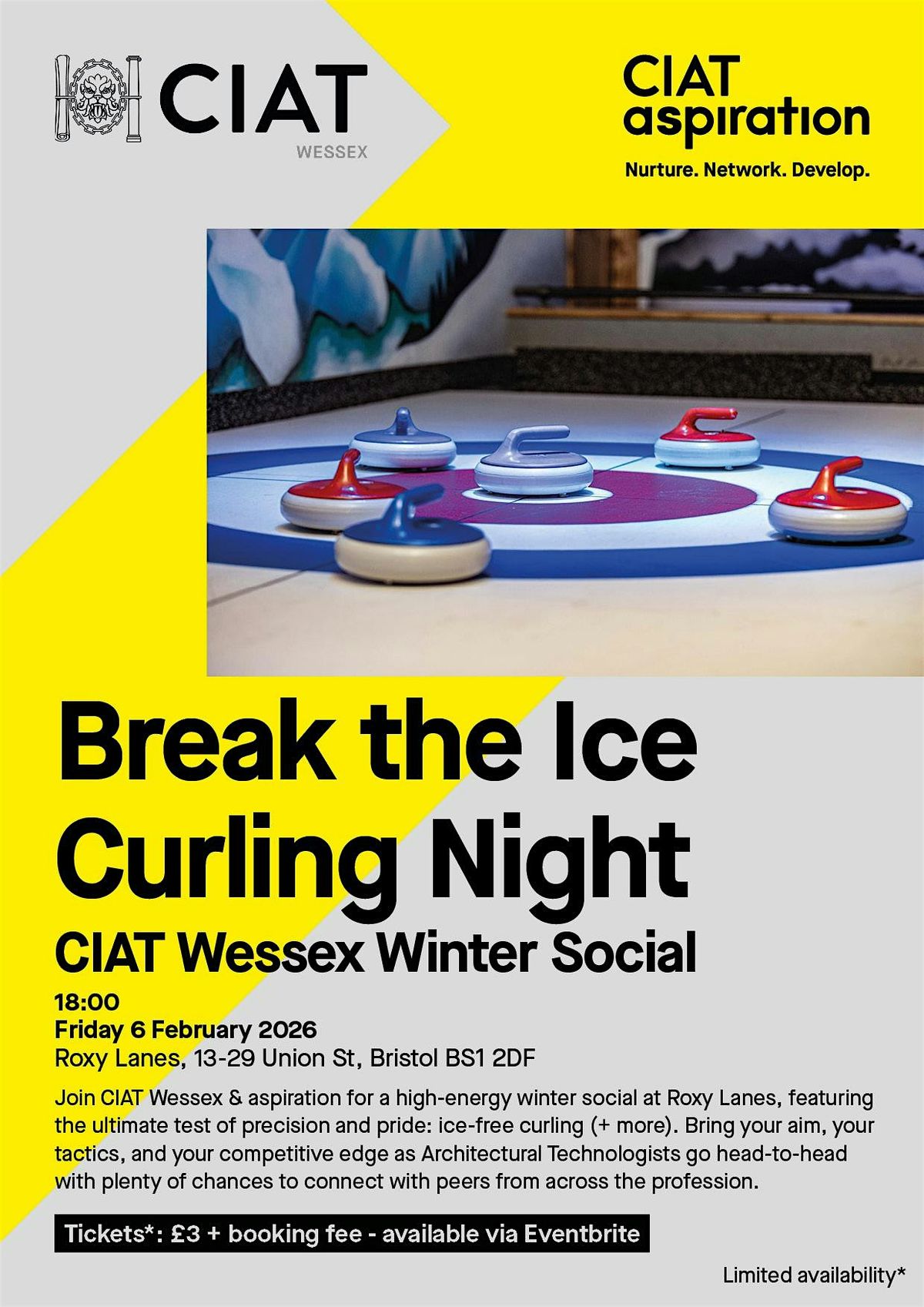 Join CIAT Wessex & aspiration for a high-energy winter social at Roxy Lanes, feature the utimate test of precision and pride: Ice-free curling (+more). Bring your aim, your tatics and your competitive edge amongst other architectural technologist as you go head-to-head with plenty of chance to connect with likeminded individuals across the profession.