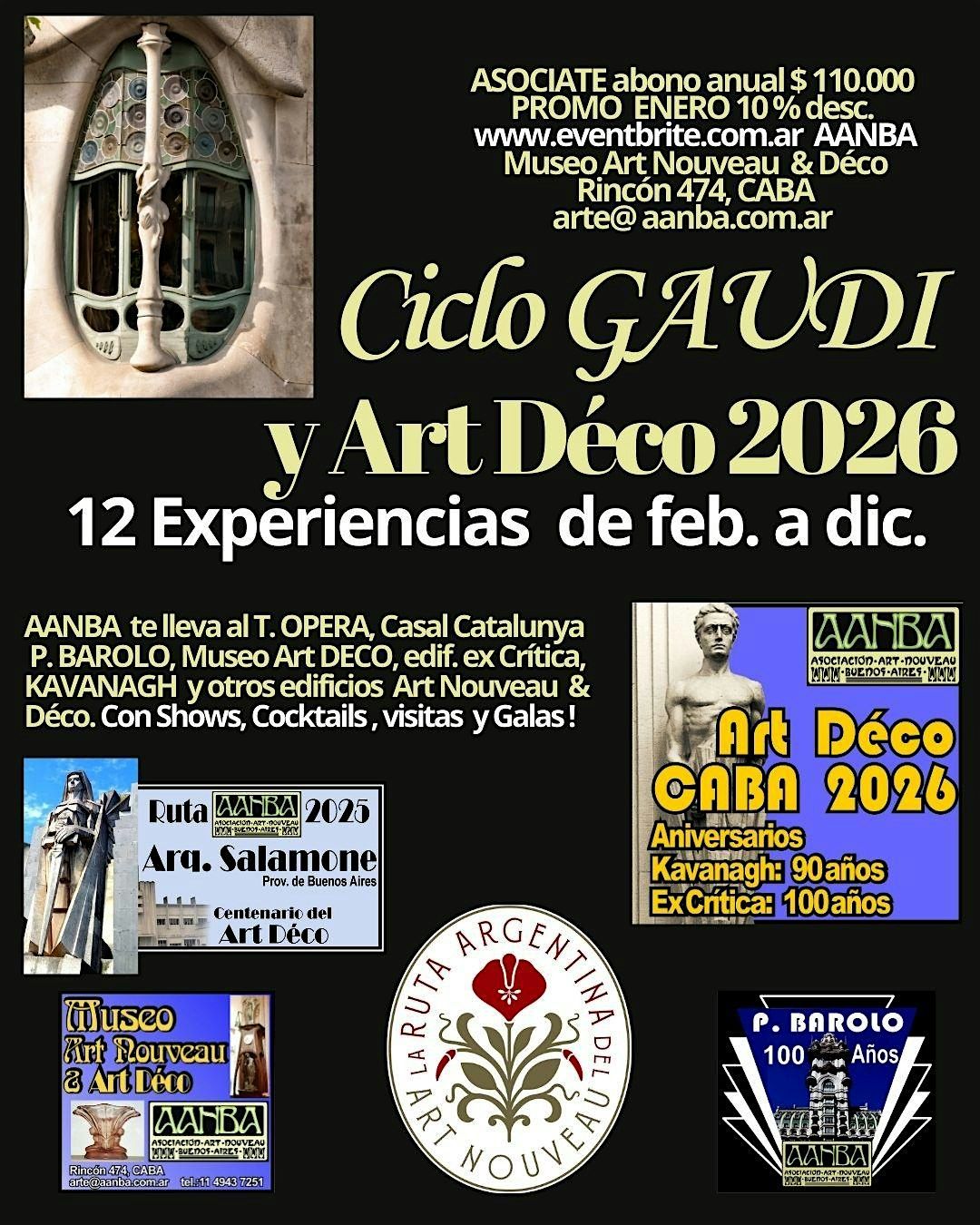 PROMO 12 actividades "CICLO 2026 GAUDI y Art DECO" de AANBA, de feb. a dic., 6 Experiencias sobre la obra del genio de Barcelona en su 100° Aniversario. Y otras 6 más sobre el Art Deco de Buenos Aires que tambíen cumple 100 Años. Visitas, Galas, Festejos, espectáculos o Cocktails, en el T. Opera, Edificio Kavanagh, Museo Art Déco y Nouveau AANBA, Palacio BAROLO, Casal de Catalunya y otros palacios o tesoros de la Belle Epoque de Bs. As. Los 12 eventos (promo solo $110.000 por 12 eventos, con el desc. inc.):