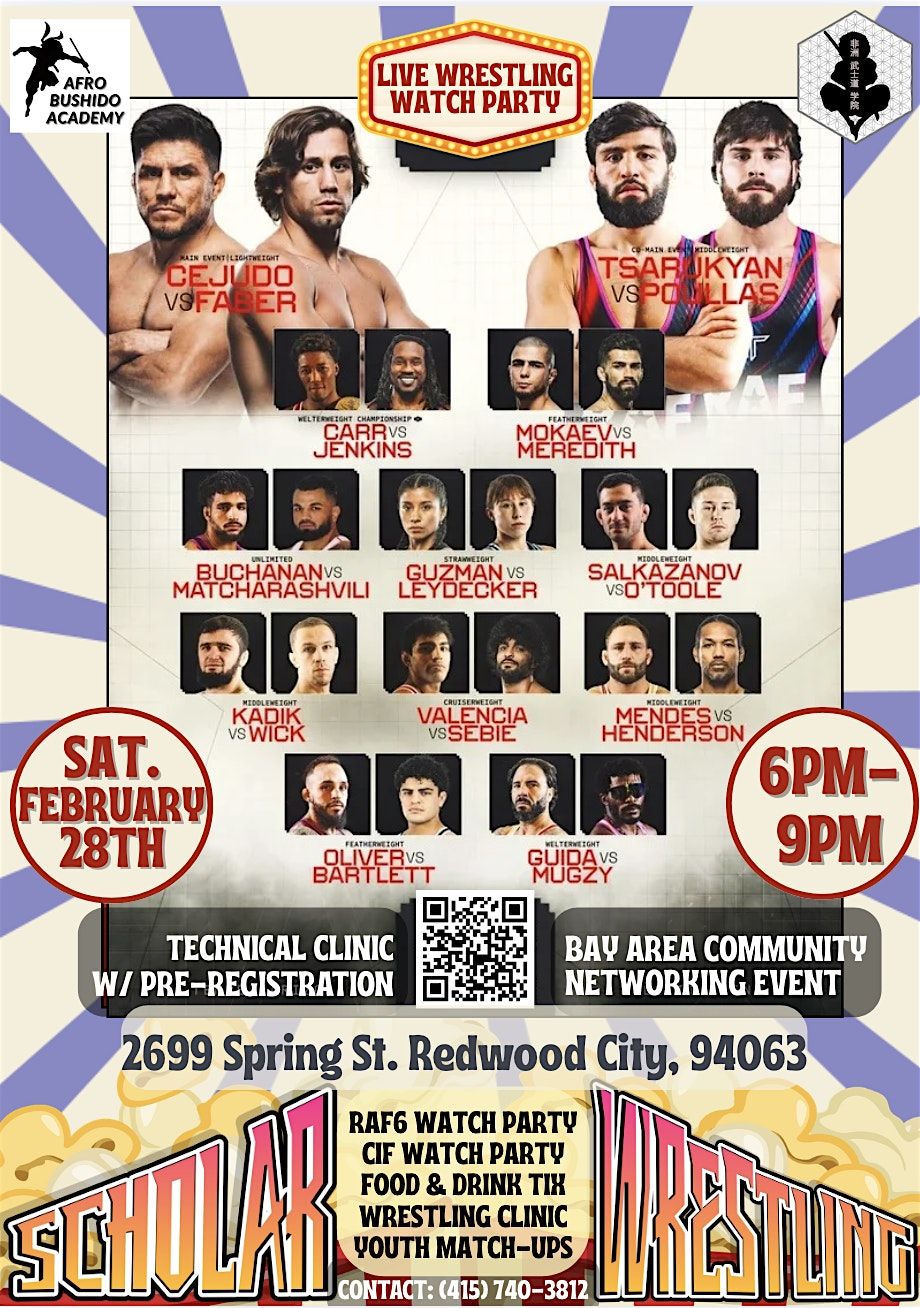 Join us in person for an epic night watching the high school California Interscholastic Federation (CIF) Wrestling State Finals & RAF6 Live Watch Party! Catch the action on two screens after diving into hands-on wrestling moves with Hall of Famers. Whether you're a hardcore fan or just curious, this is the perfect chance to hang out, learn some cool skills, and vibe with fellow wrestling lovers. Don't miss out on this awesome combo of live entertainment and exclusive training!