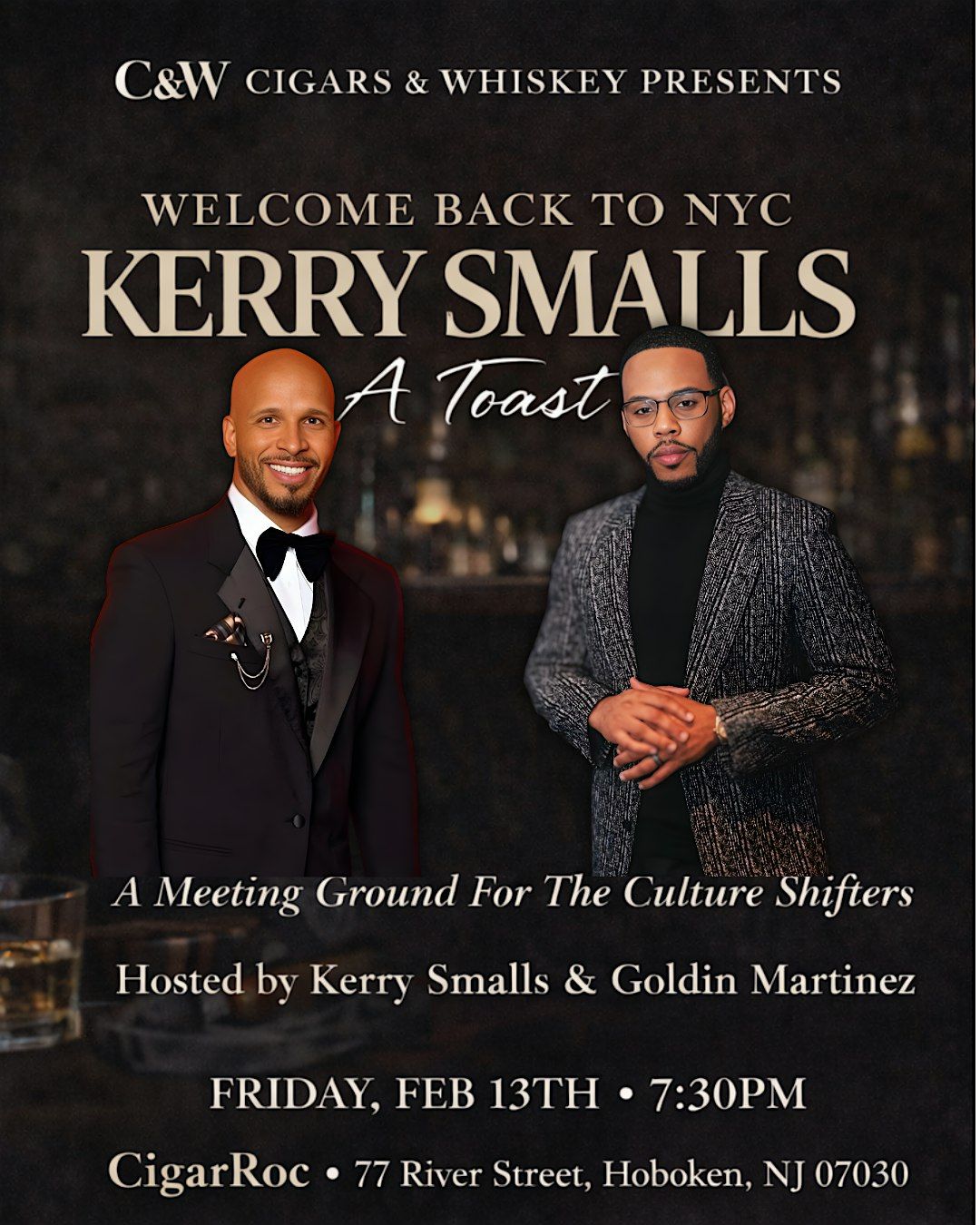 Get ready for an unforgettable night in the heart of NYC! Join us in person as we celebrate the return of Kerry Smalls, the founder of Cigars & Whiskey, to NYC. Expect great vibes, smooth cigars, and top-notch cocktails. FREE RSVP! Let's look forward to reconnecting, networking and building this coveted community, together!