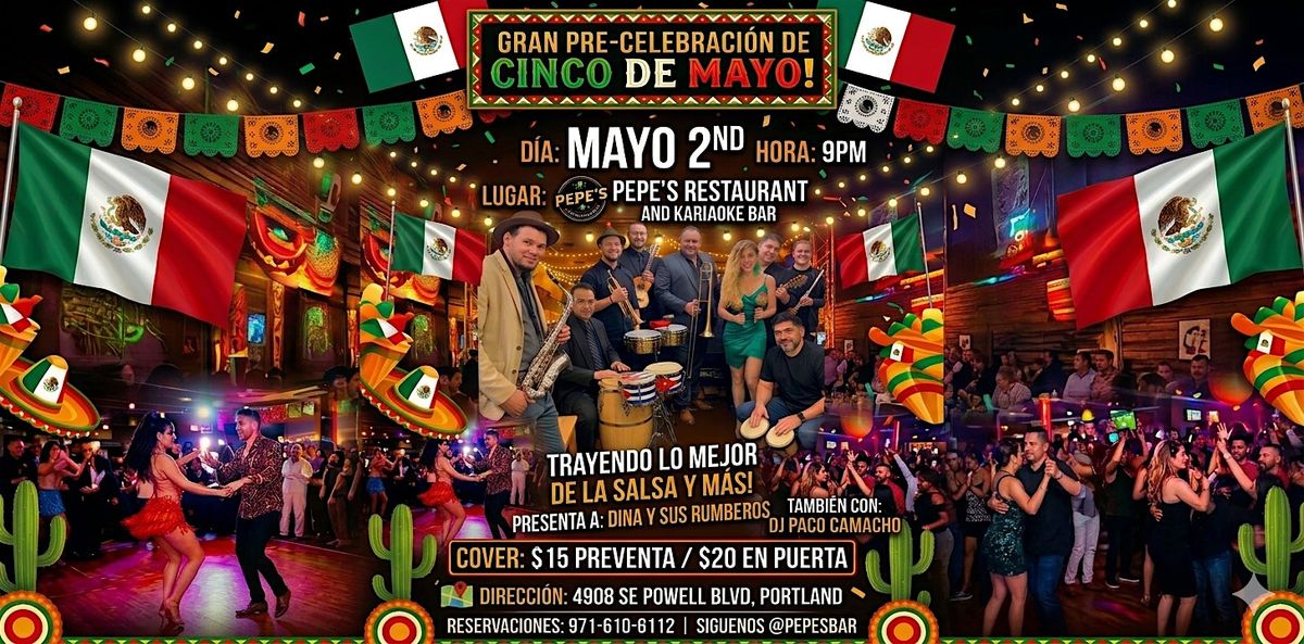 Celebrate Cinco de Mayo early at Pepe's! Friday May 2nd — live music by Orquesta Dina y Los Rumberos + DJ Paco Camacho spinning cumbia, salsa & sonidero all night. Authentic Mexican food, signature drinks & karaoke after the show. 4908 SE Powell Blvd, SE Portland. 9PM–2AM. $15 cover. The biggest Latin party of the year!some Food and drinks offers.